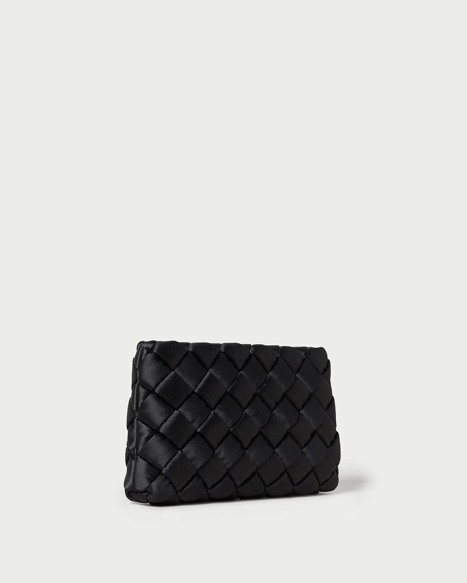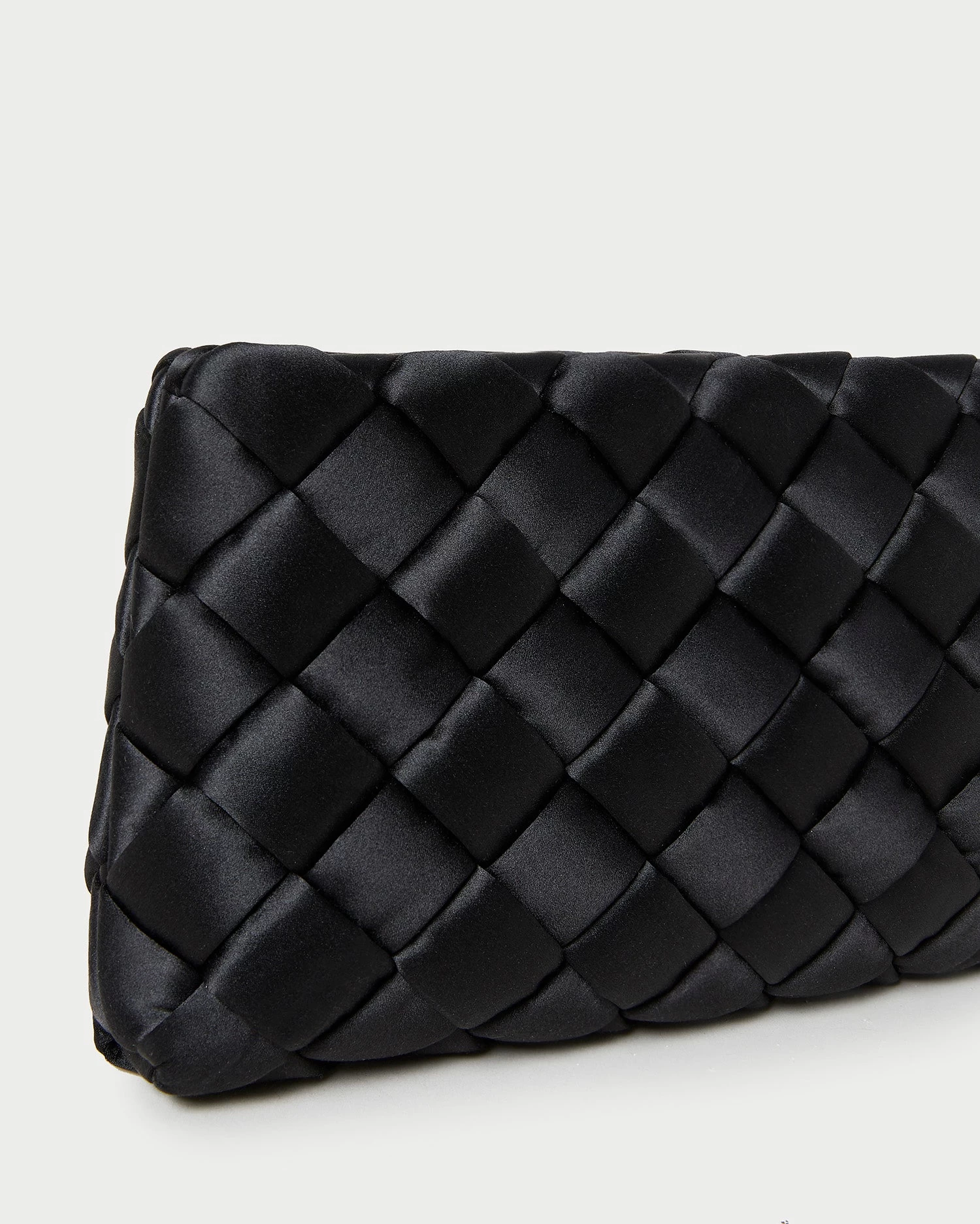 Puffy woven clutch in black satin. Features a frame closure, full lining, and interior card slot.