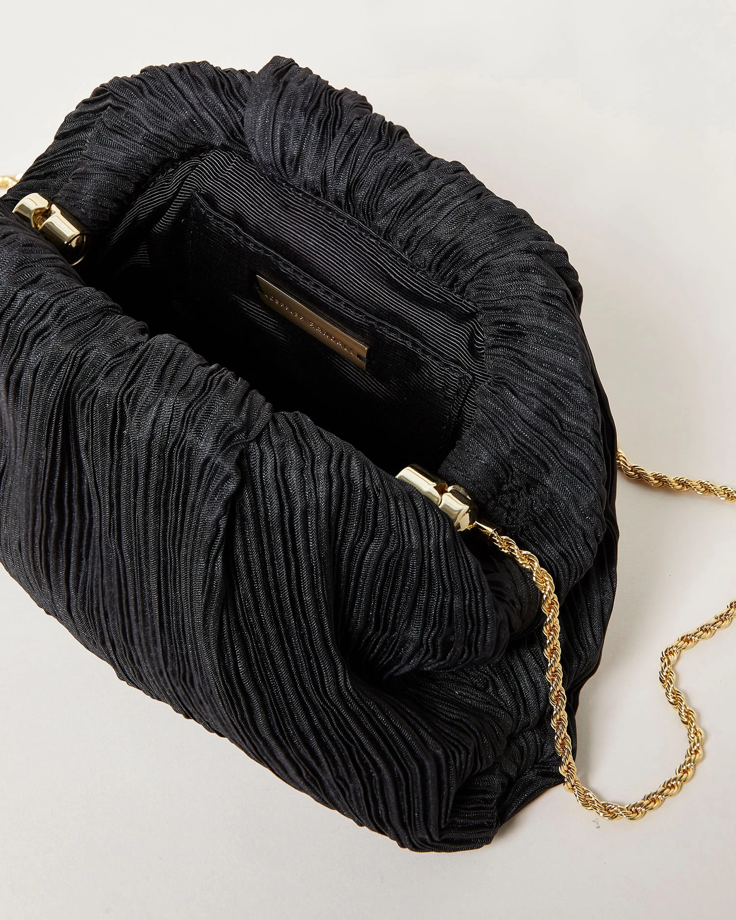 Pleated, dome-shaped frame pouch in black shantung. Features a removable twisted gold metal chain strap, frame closure, full lining, and interior card slot.
