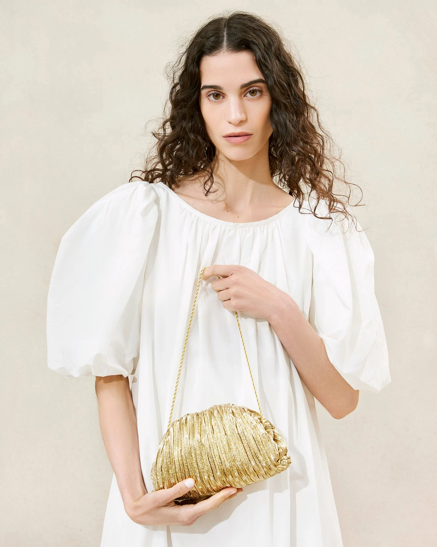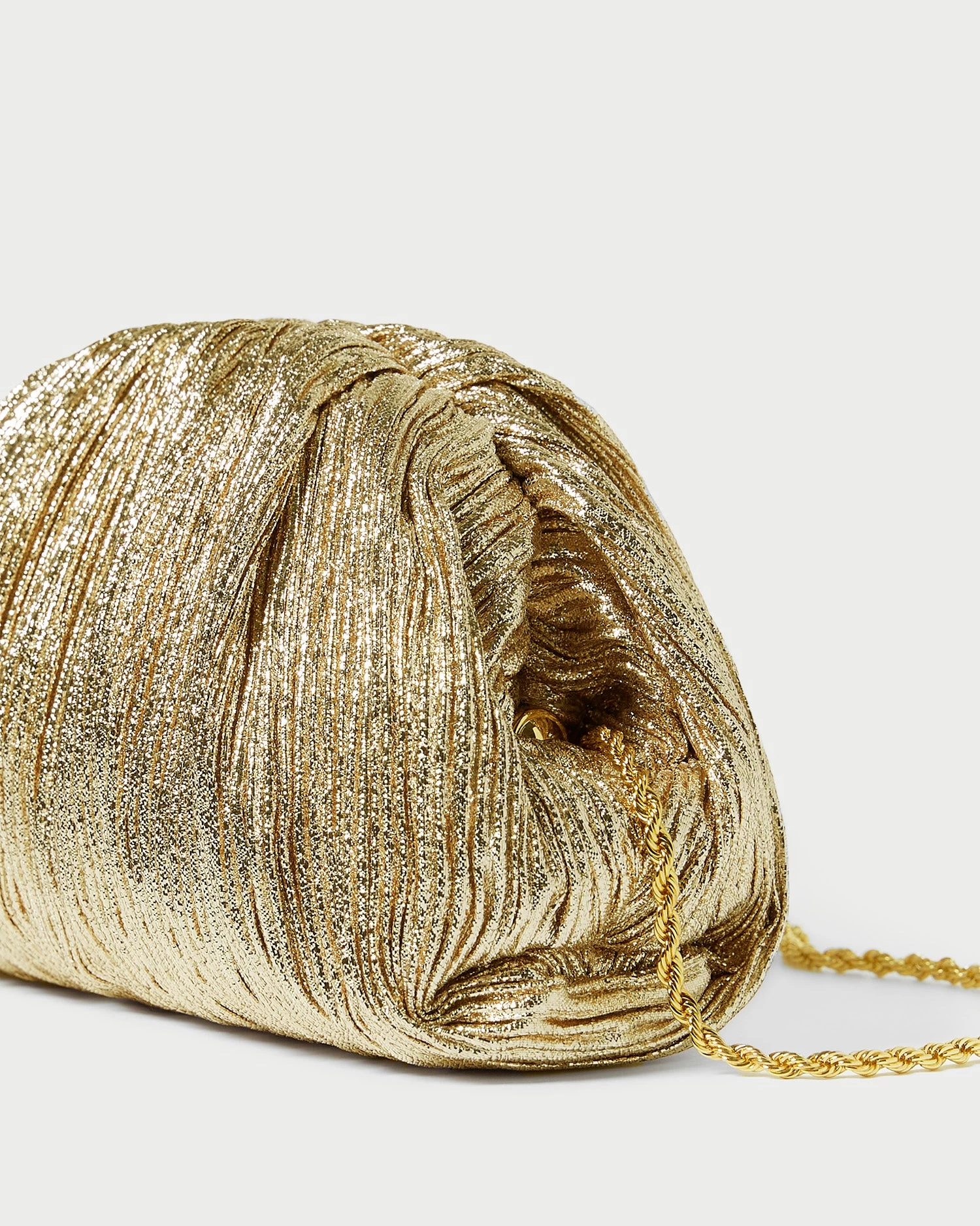 Pleated, dome-shaped frame pouch in Italian oro lamé. Features a removable twisted gold metal shoulder strap, frame closure, full lining, and interior card slot.