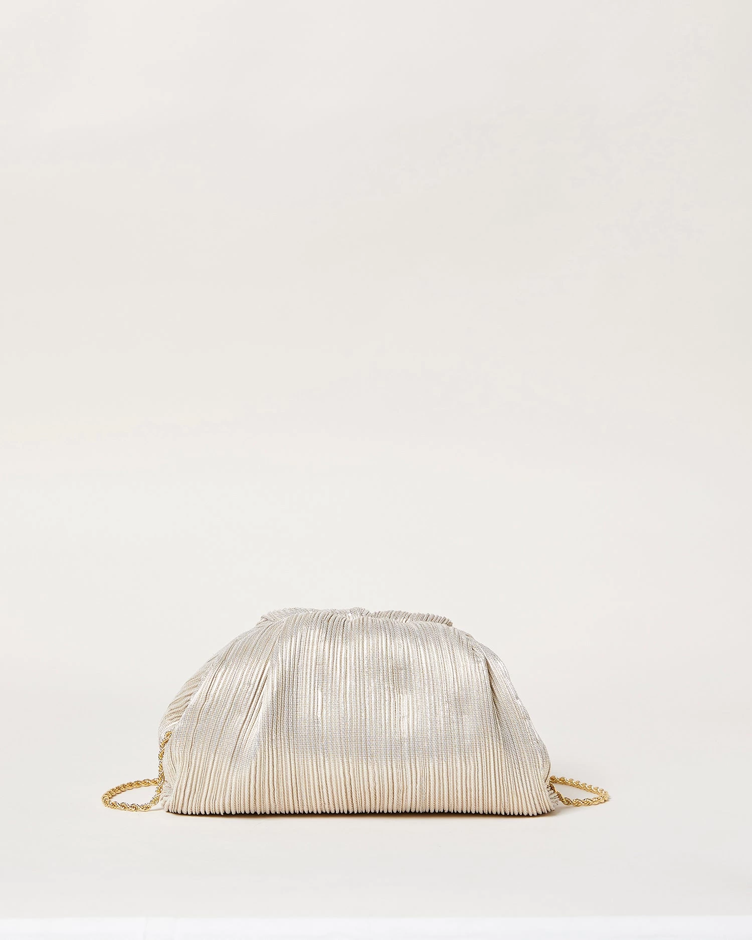 Pleated, dome-shaped frame pouch in platinum lamé. Features a removable twisted gold metal chain strap, frame closure, full lining, and interior card slot.