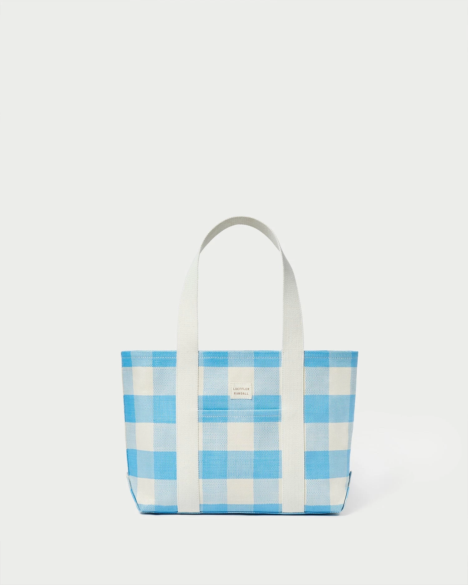 Open tote bag in blue and cream gingham-printed woven plastic. Features cotton webbing handles, an inside pocket, and a slightly smaller size than our best-selling Bodie Tote.