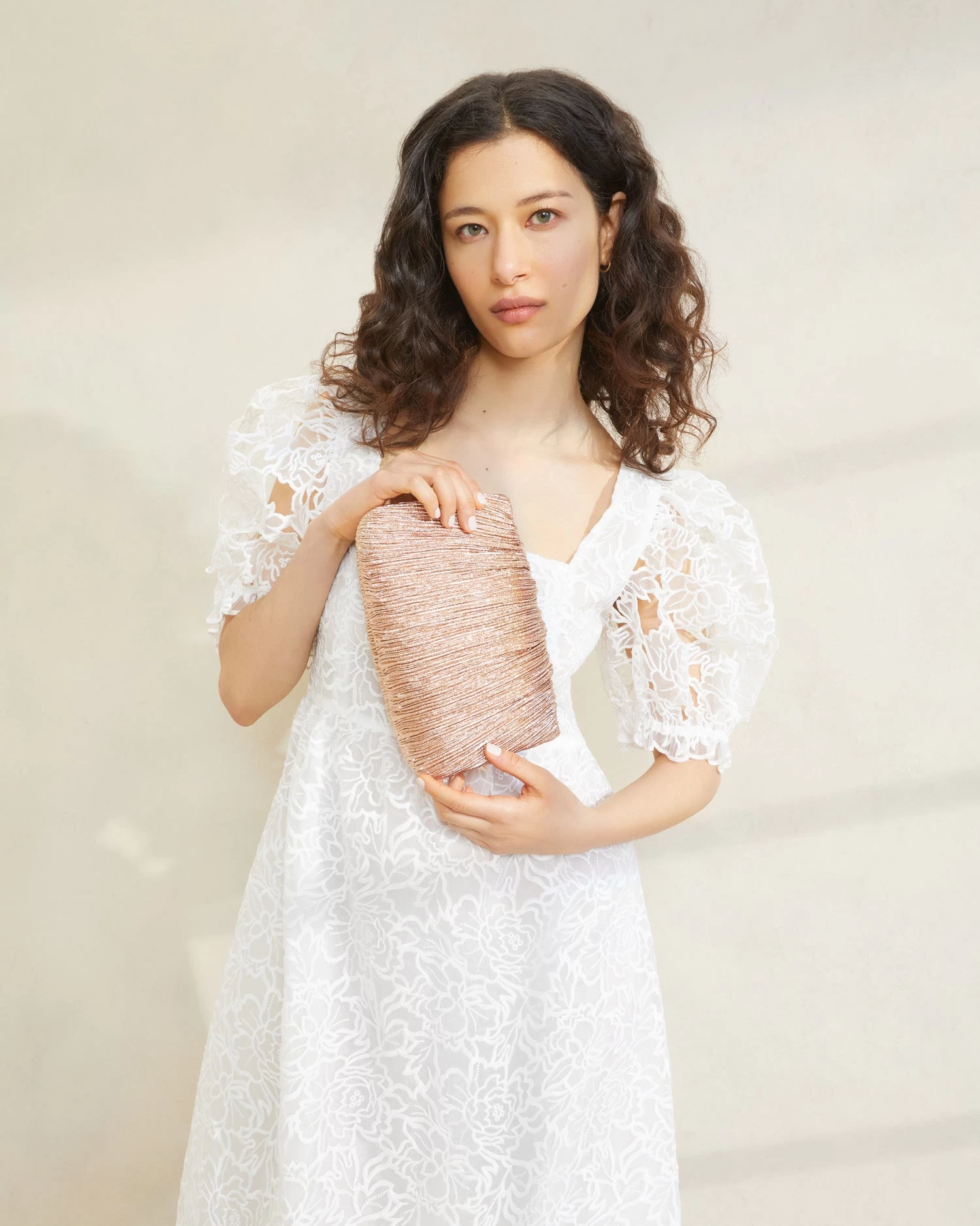 Flat pleated pouch in dune Italian lamé. Features a removable twisted gold metal chain strap, frame closure, full lining, and interior card slot.