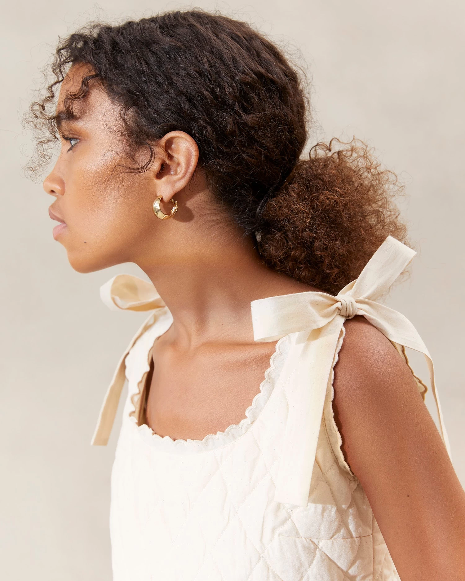 Cropped sleeveless blouse in natural-colored muslin. Features a quilted texture, ribbon ties at the shoulders, and delicate scalloped trim. Pairs beautifully with the matching Leigh skirt.
