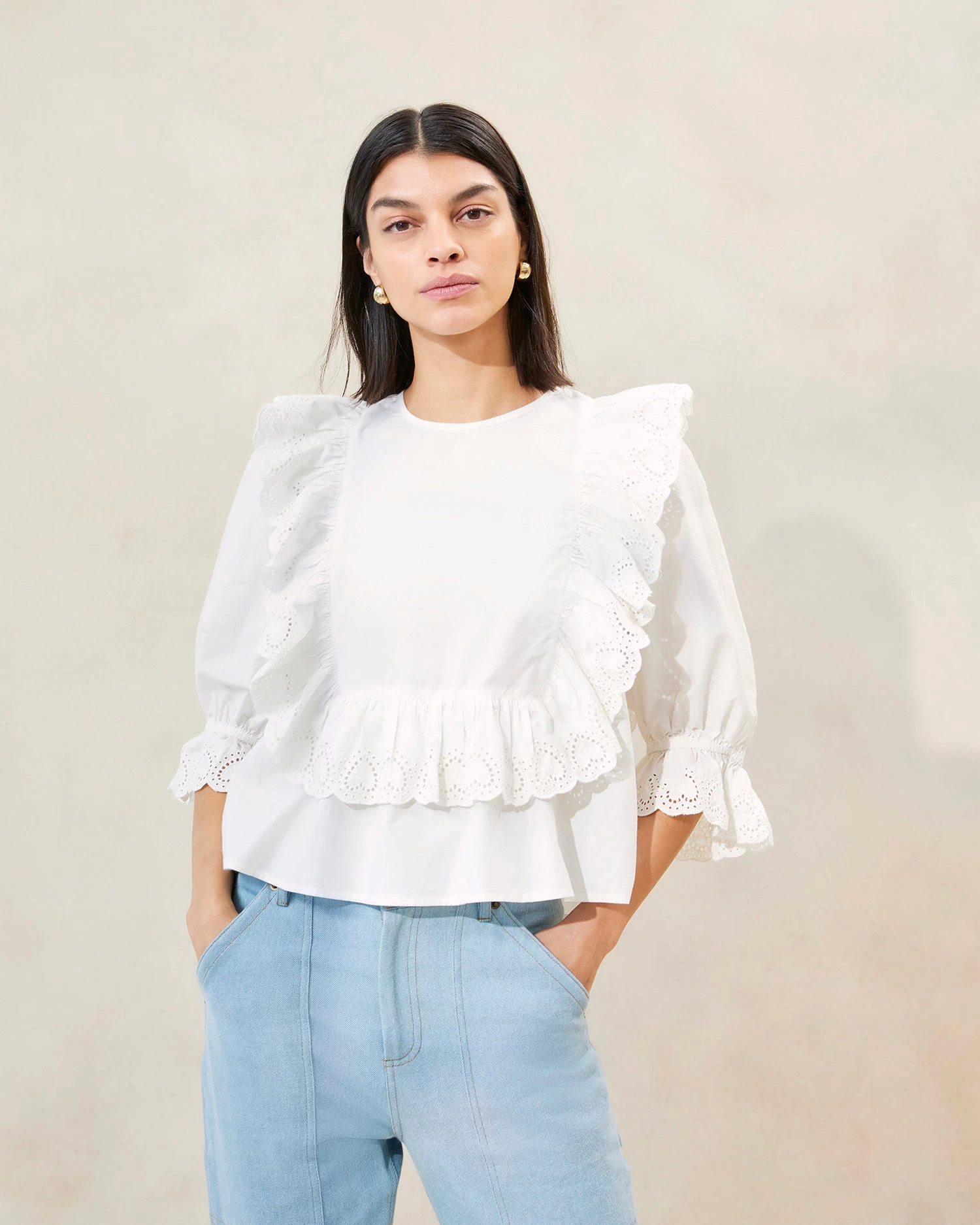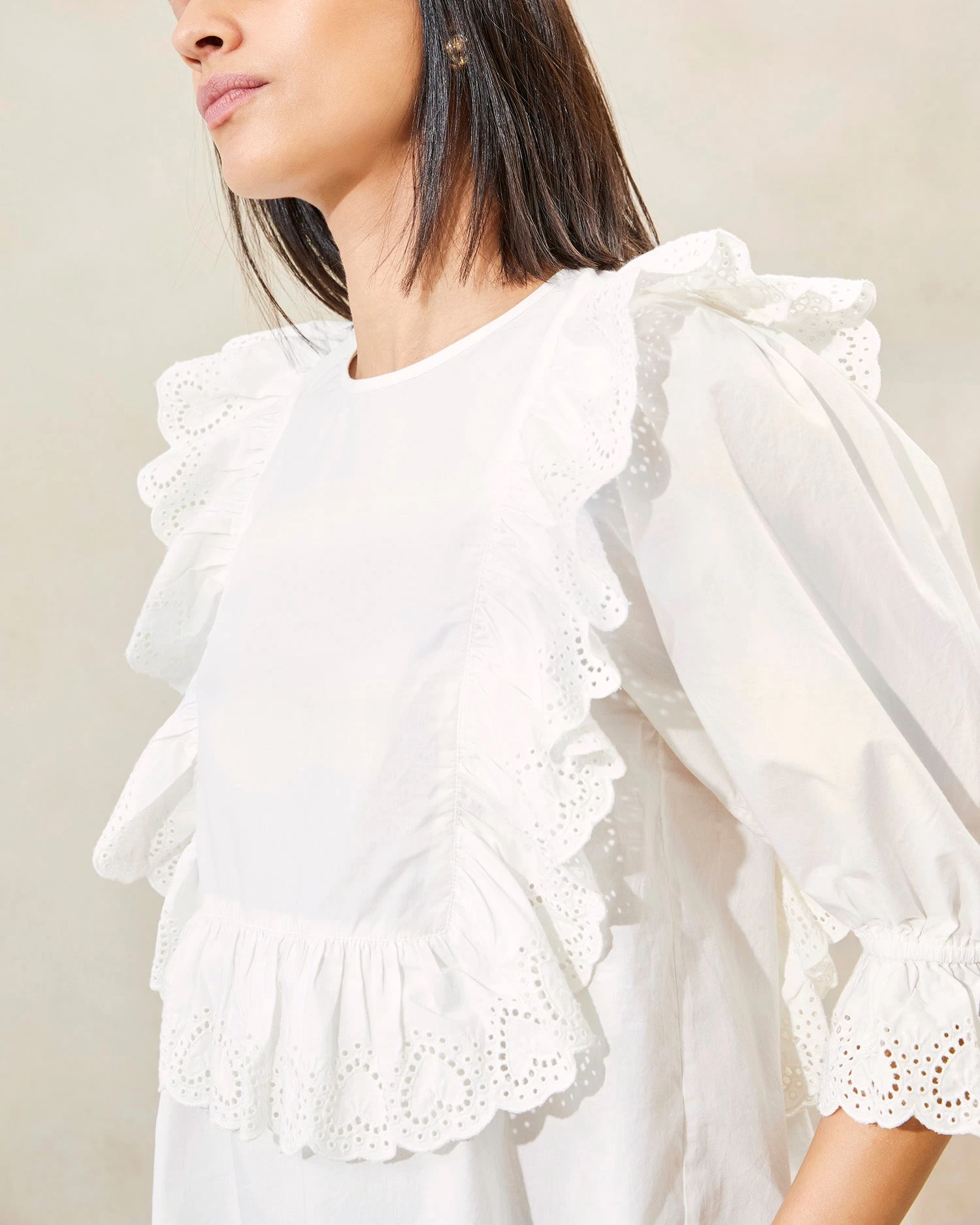 Ruffled blouse with heart eyelet trim in white cotton. Closes at the center back with a button and features elastic at the wrists.