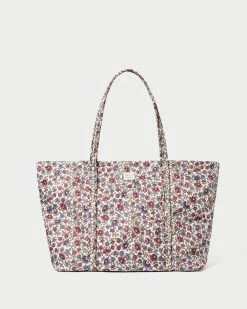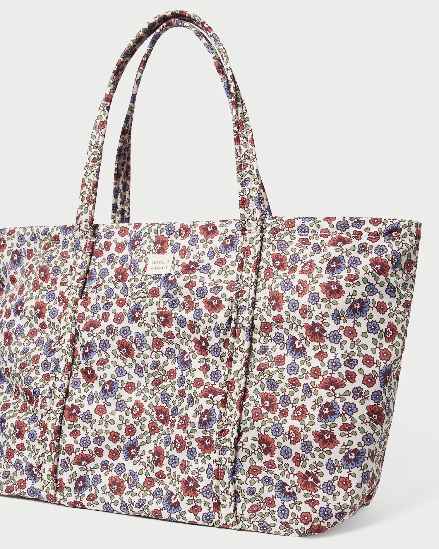Travel tote in folk floral print nylon. Features thin handles, zippered exterior pockets, a back panel to slip over luggage handles, and a roomy interior similar to our best-selling Avery weekender tote.