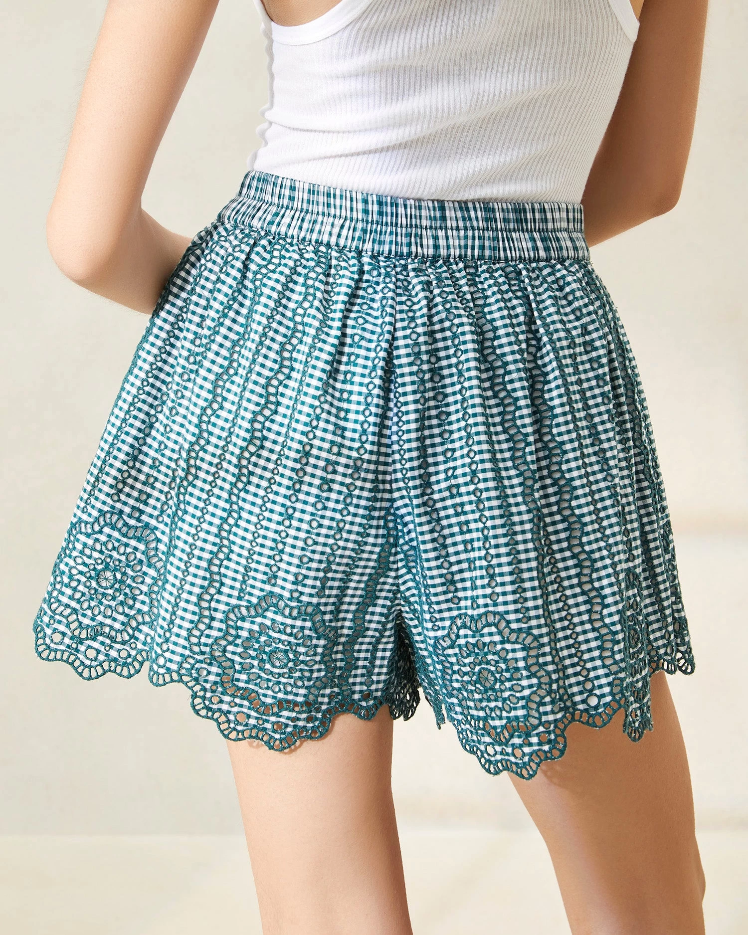 Scalloped eyelet shorts in mini green gingham-printed cotton. Features an elastic waist, cotton lining, and pockets. Dorian pairs perfectly with our Arden blouse.