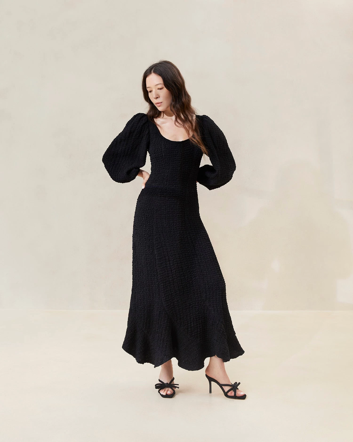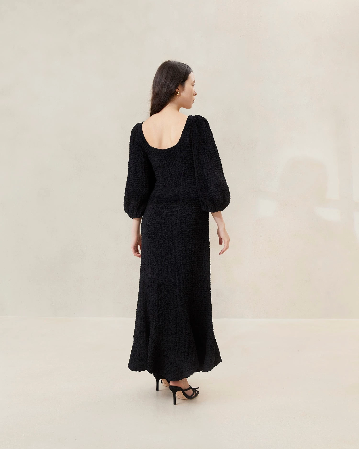 Midi dress in black puckered fabric. Features balloon sleeves, a squared neckline, and a flowy skirt.