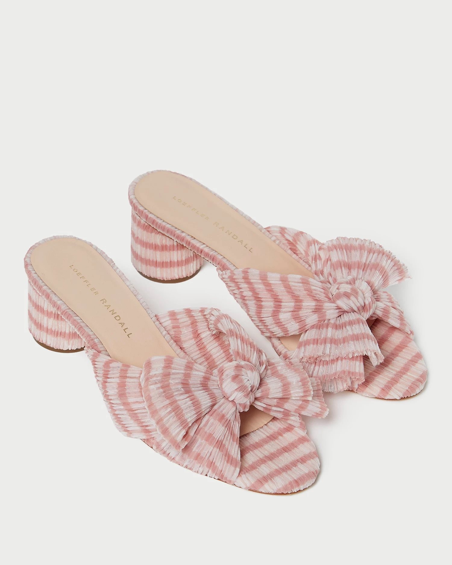 Pleated mid-heel sandal in soft pink gingham-printed fabric topped with our signature knotted bow. Features a padded footbed with gold stamped logo. Open toe, slips on. 2-inch heel.