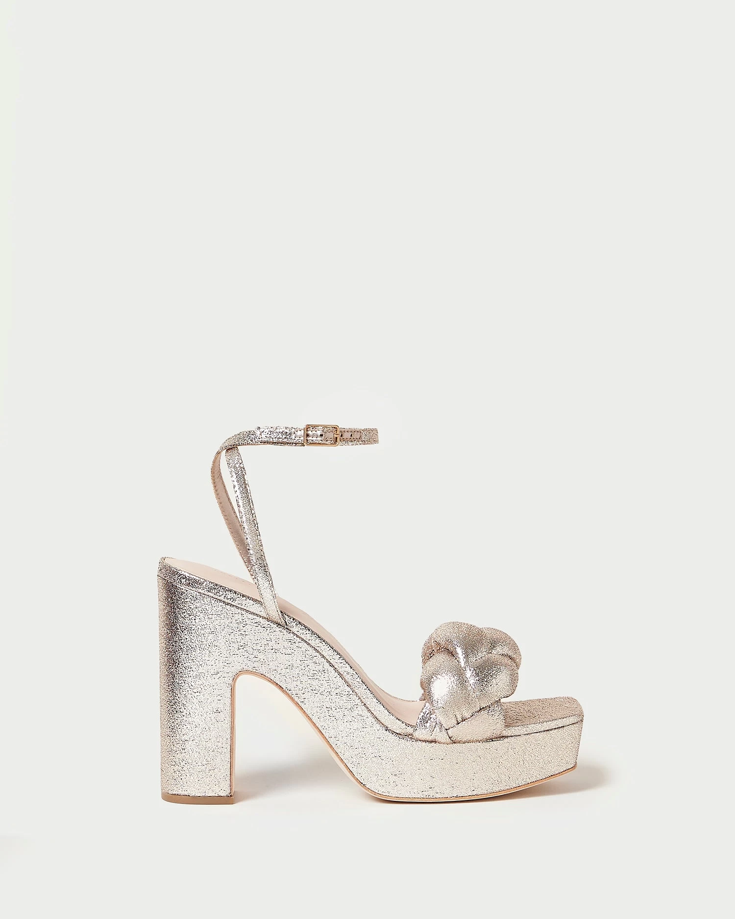 Platform sandal in prosecco metallic lamé with puffy braided detail. Padded raised footbed with gold stamped logo. Open toe with adjustable buckle ankle strap. 1″ platform, 4.5″ heel.
