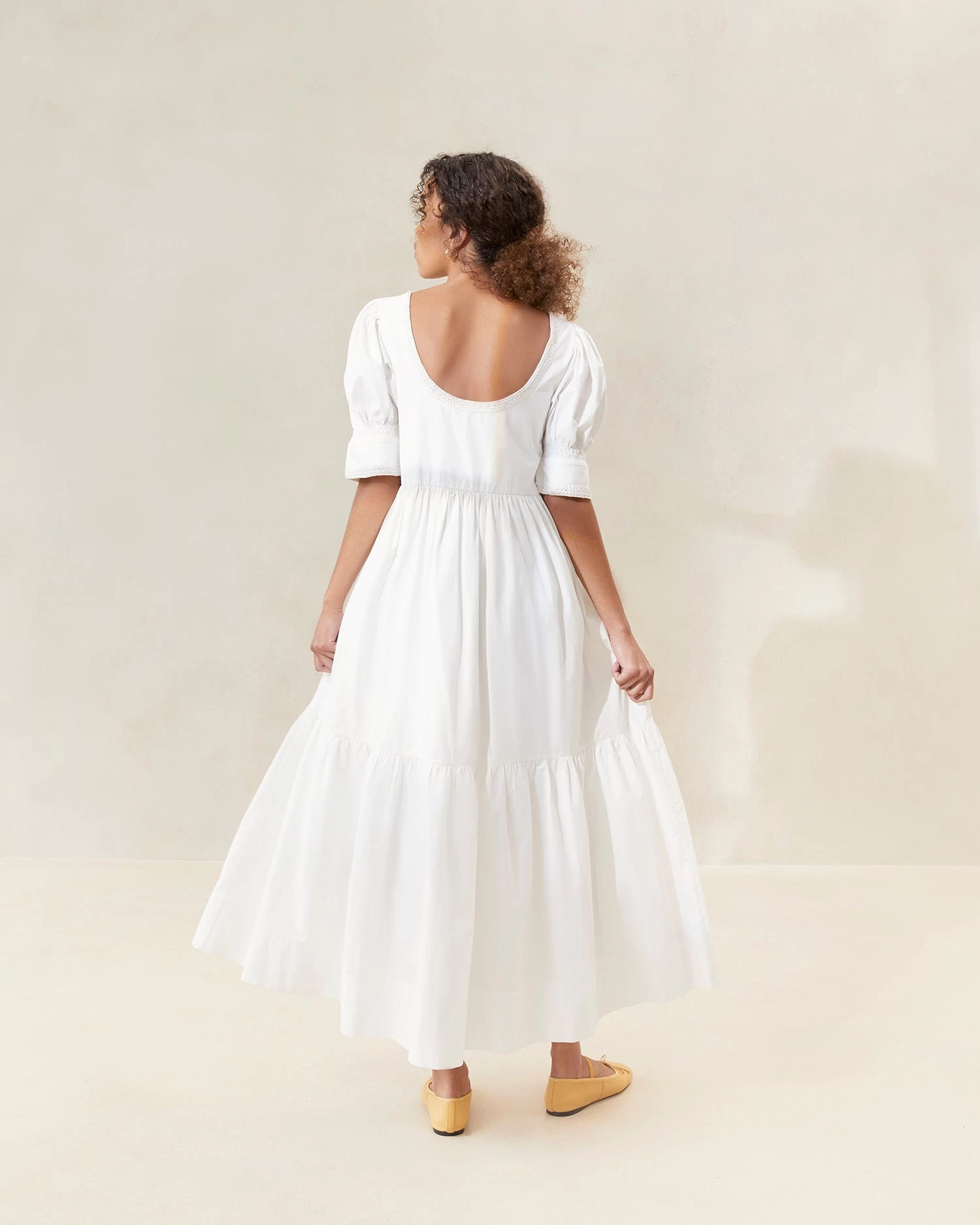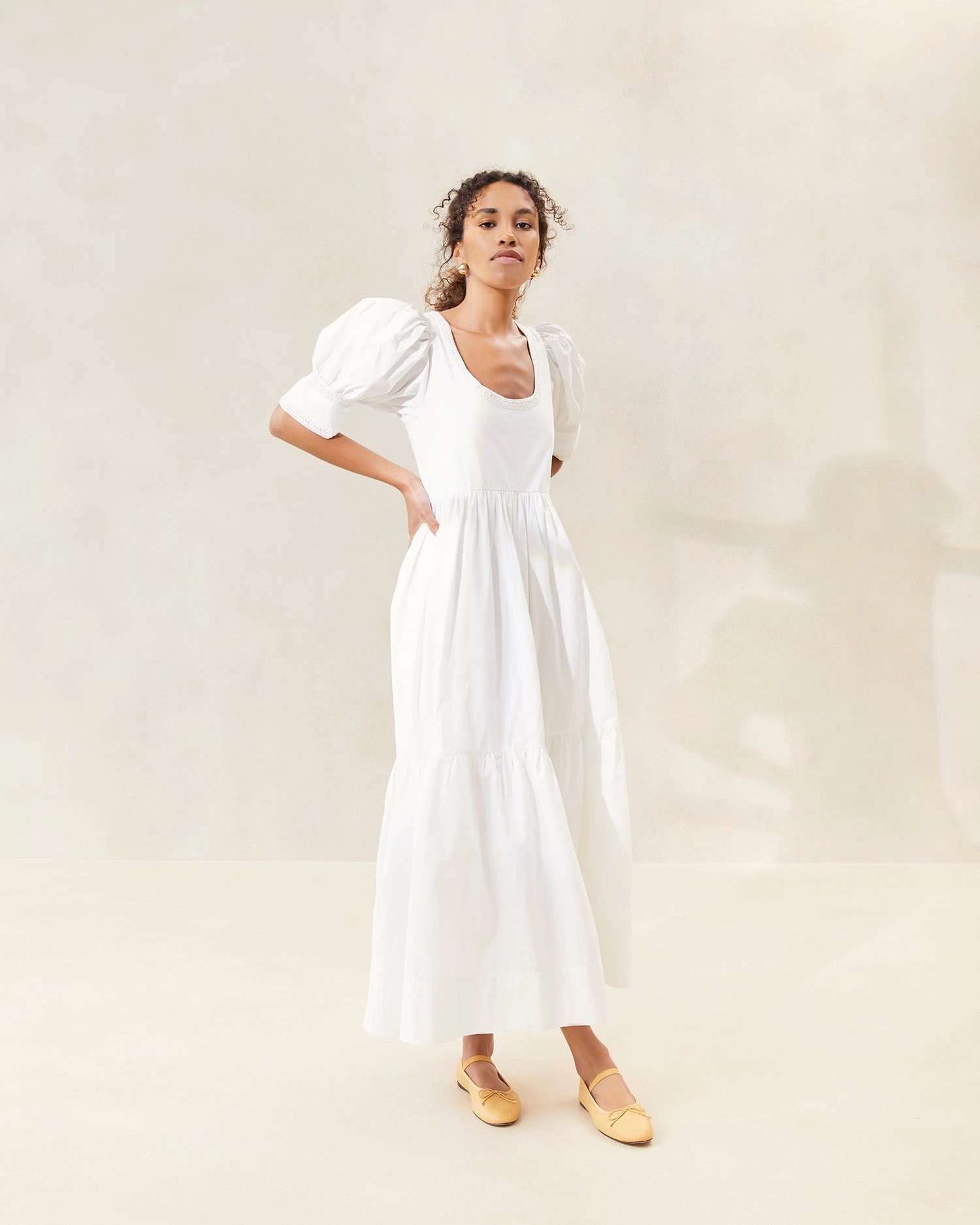 Midi tiered dress in milk-hued poplin. Features puff sleeves, cinched bodice, pockets, and cream-colored whipstitch trim.
