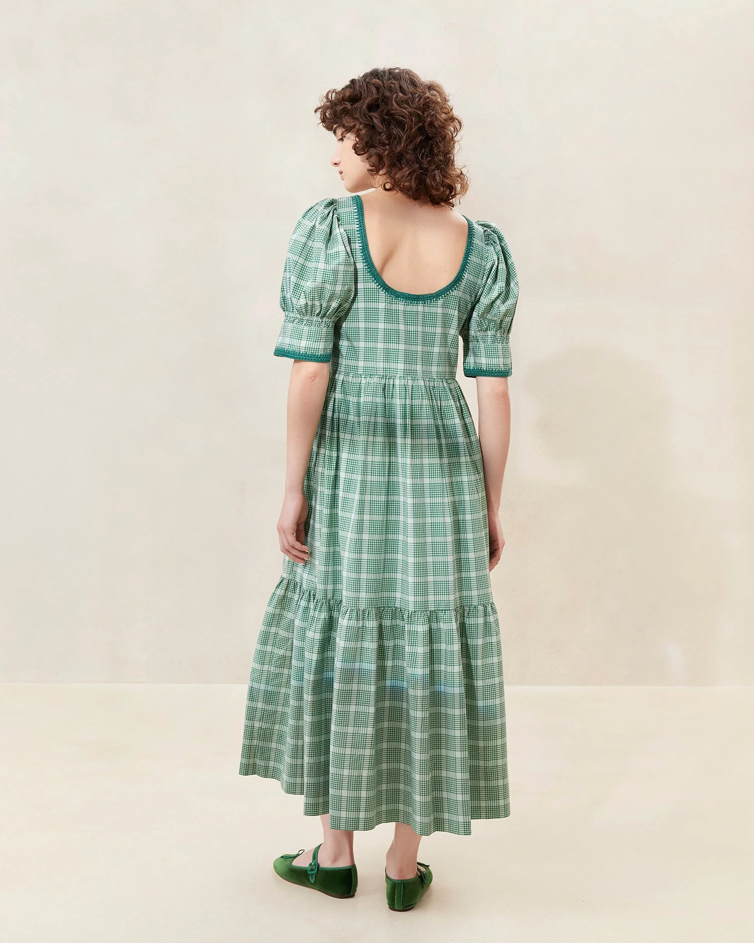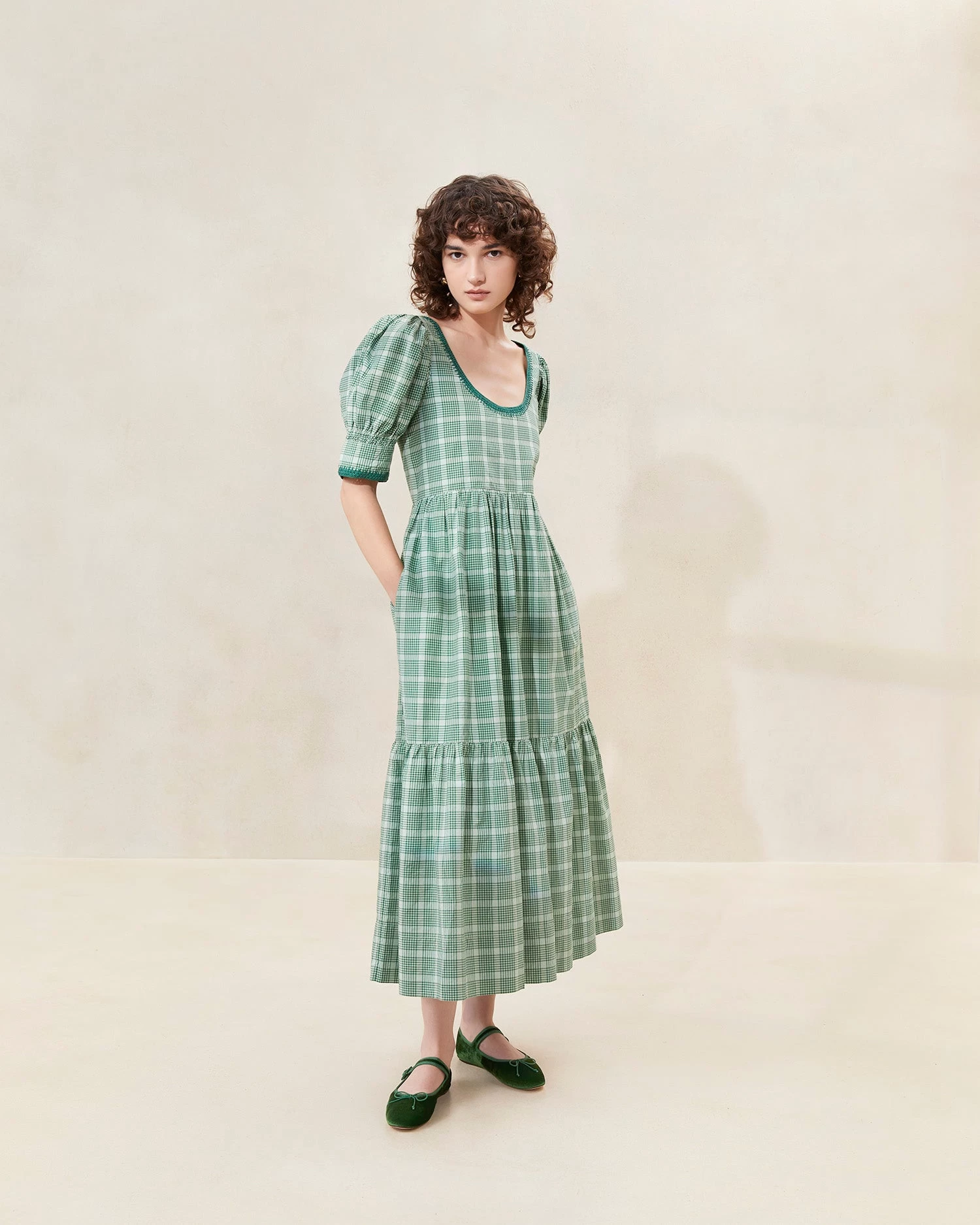 Midi tiered dress in mint green plaid taffeta. Features puff sleeves, a cinched bodice, pockets, and cream-colored whipstitch trim.