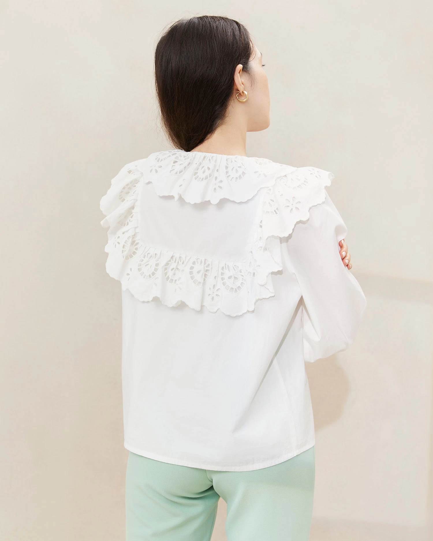 Blouse in milk-colored poplin. The perfect layering piece, Hazel hits at the hip and features puff sleeves, broderie lace collar and detailing, and button closures at the front and sleeves.