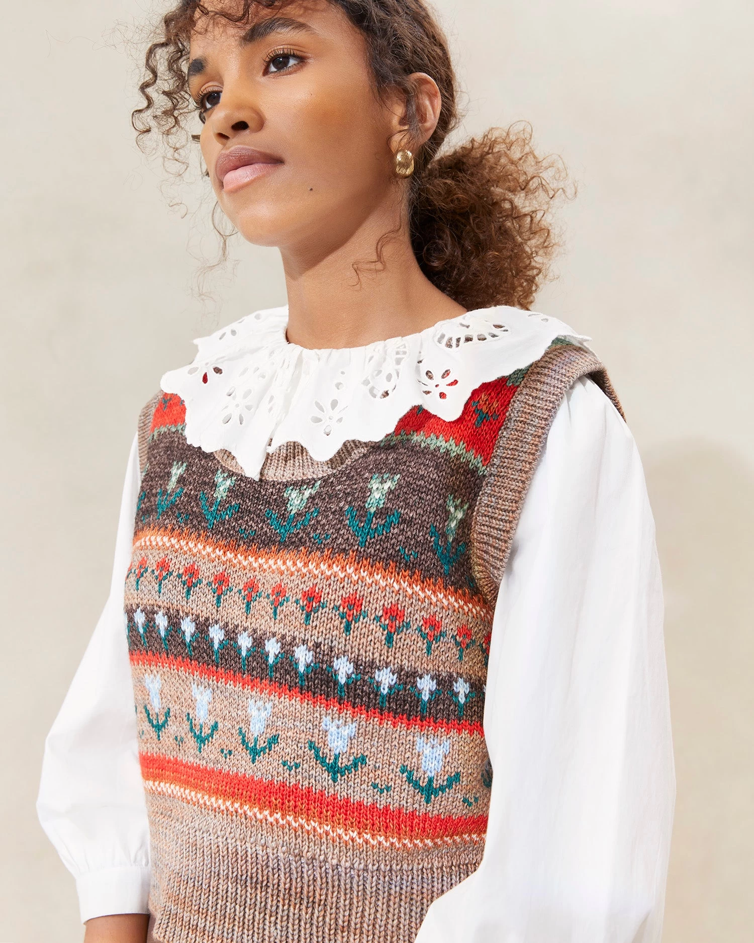 Mid-weight sweater vest in heather brown wool with floral intarsia stripe. Hits at waist. This sweater is 100% Andean Highland wool made in Peru by a collective of knitters whose work provides support to women and children living in poverty on an island called Amantani on Lake Titicaca.