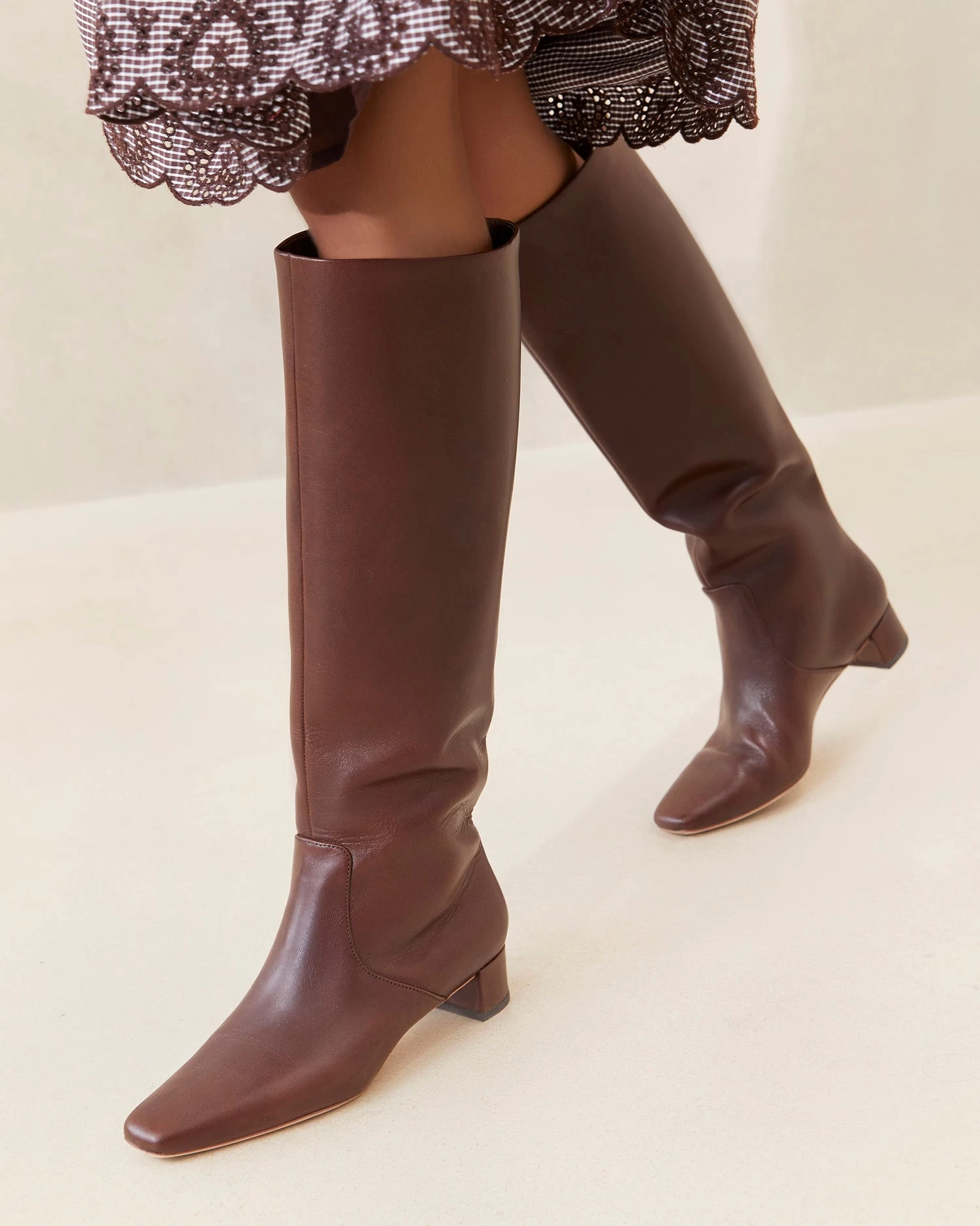 Tall mid-heeled boot in espresso brown Italian leather. Features a padded leather footbed with gold stamped logo, an elongated toe, and a zipper closure. 1.5-inch heel.