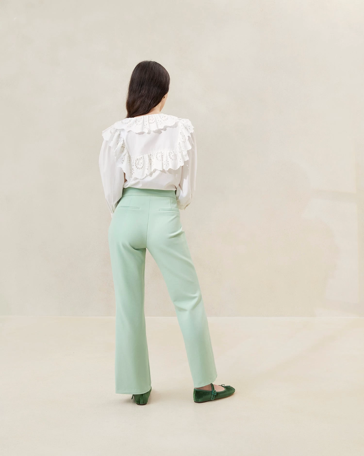 Straight-leg trousers in pistachio green stretch twill. Made in a thicker fabric with a bit of give, Jeanne is fitted through the leg with a kick flare at the hem. Features a zipper closure at the side.