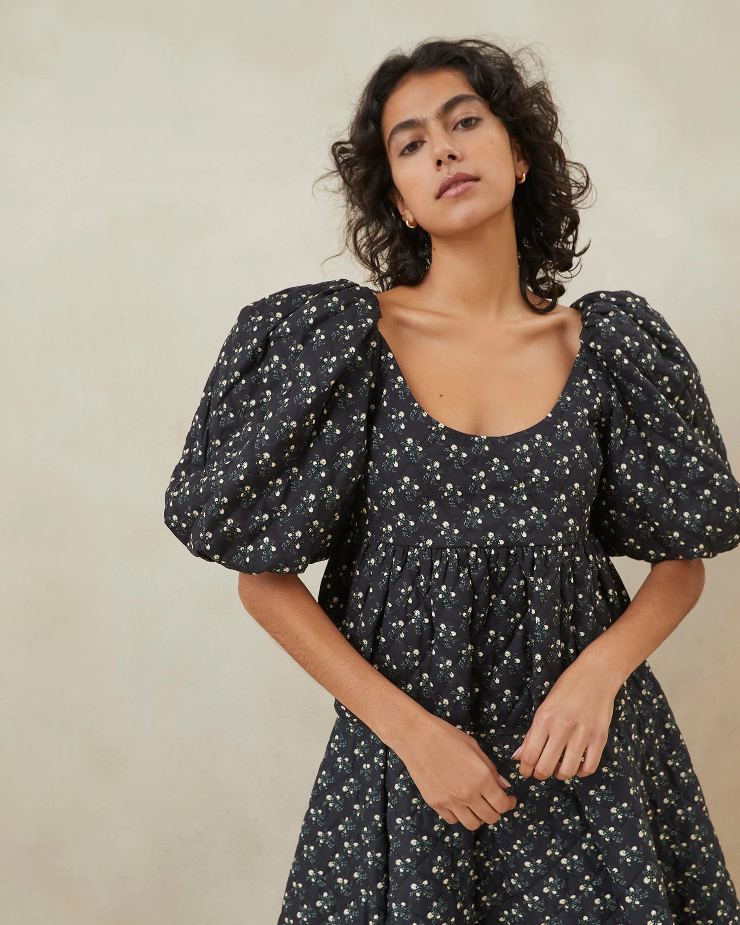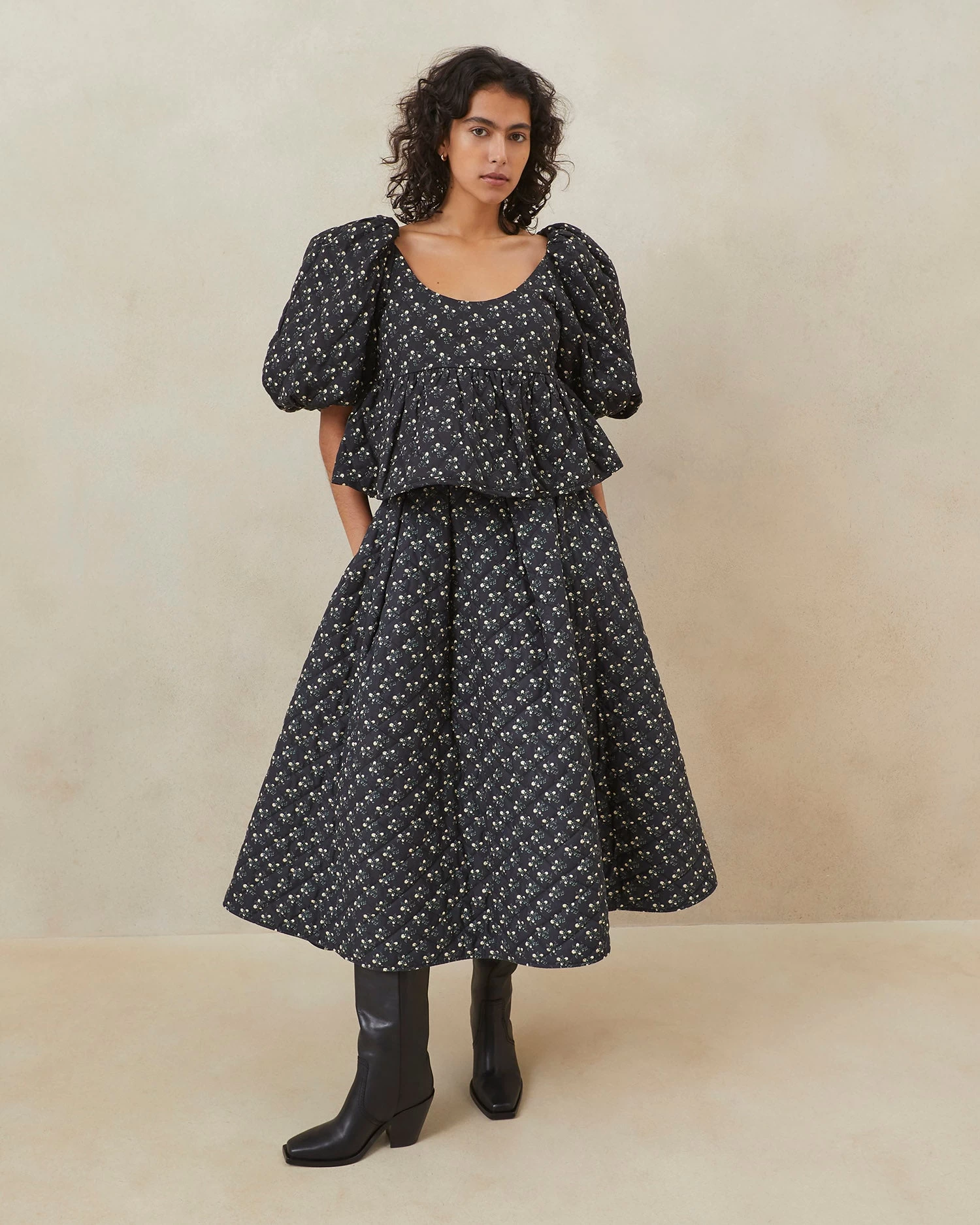 Puff-sleeved babydoll blouse in black ditsy floral quilted cotton. Features a rounded neckline, fitted waist, and flared hem.