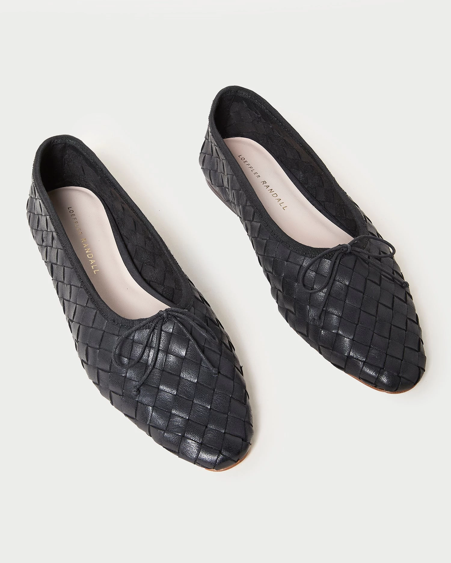Ballet flat in black woven leather. Features a slightly elongated, almond-shaped toe and a padded footbed. Slips on.