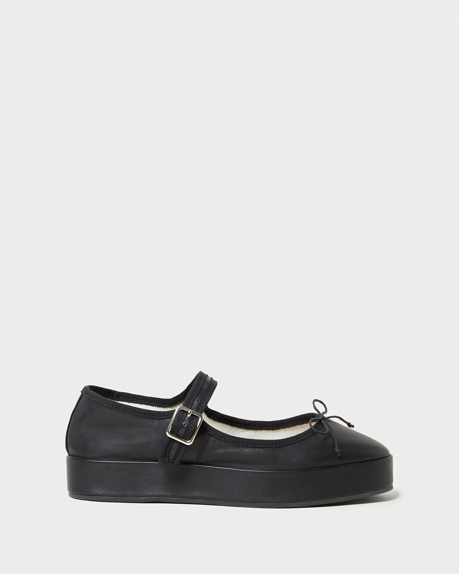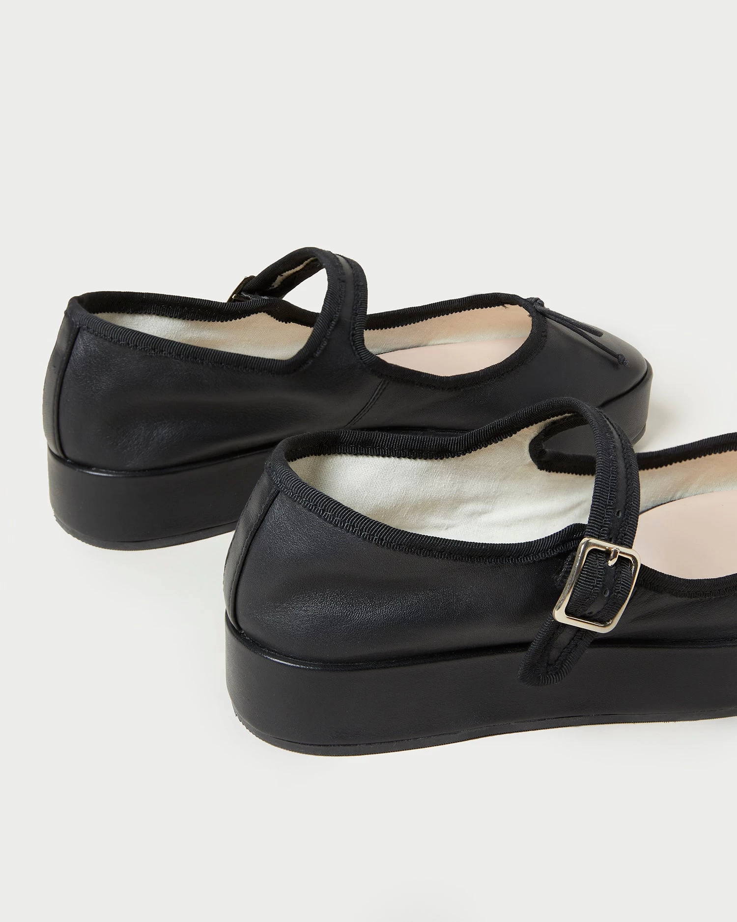 Mary jane flatform in black Italian glove calf leather with an adjustable bridge strap and bow detail. Features a padded footbed with gold stamped logo, an almond toe, and a buckle closure. 1 inch platform.