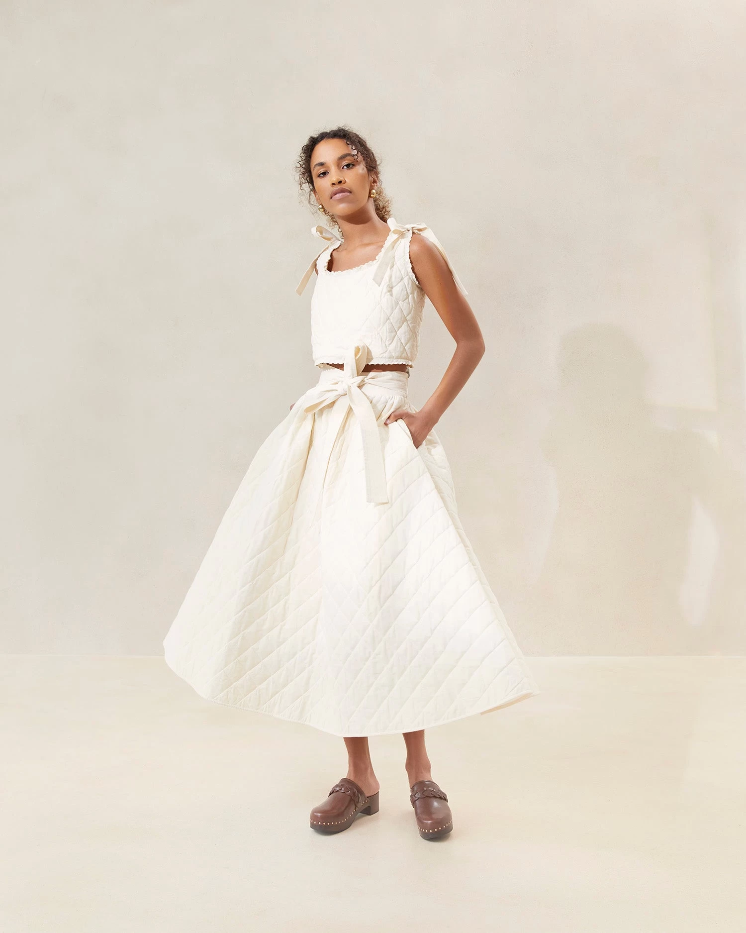Long, flowy skirt in natural-colored muslin. Features a quilted texture, two pockets, a zipper closure at the side, and an adjustable, belted waist. Pairs beautifully with the matching Cece blouse.