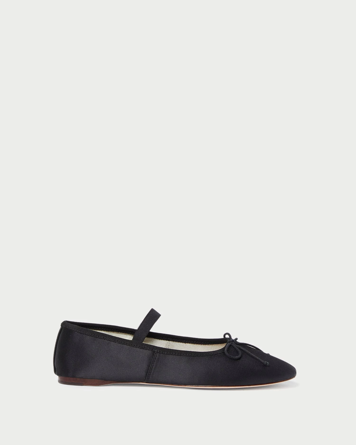 Soft ballet flat with bow detail in black satin. Features a padded leather footbed with gold stamped logo, an almond toe, and an elastic bridge strap.