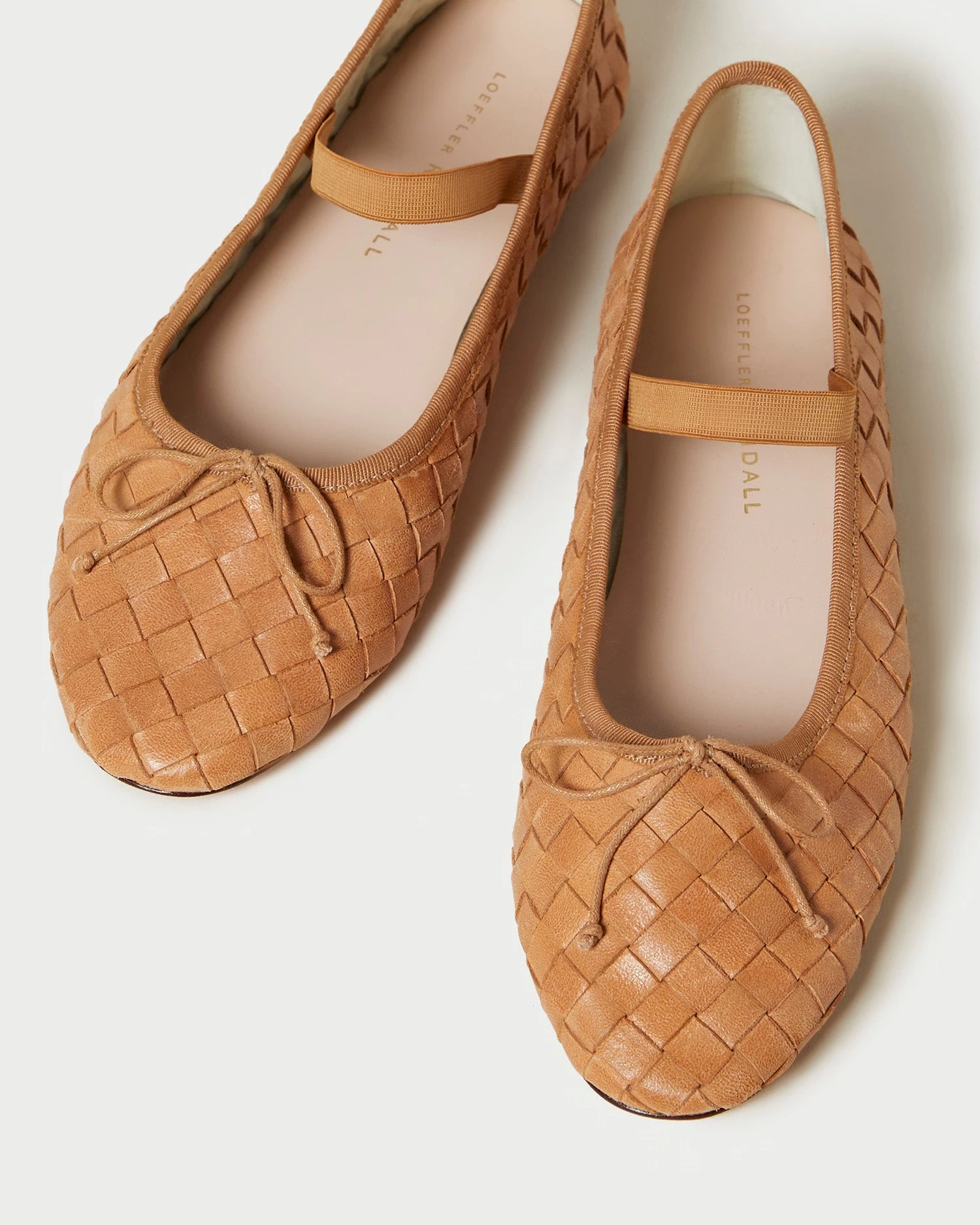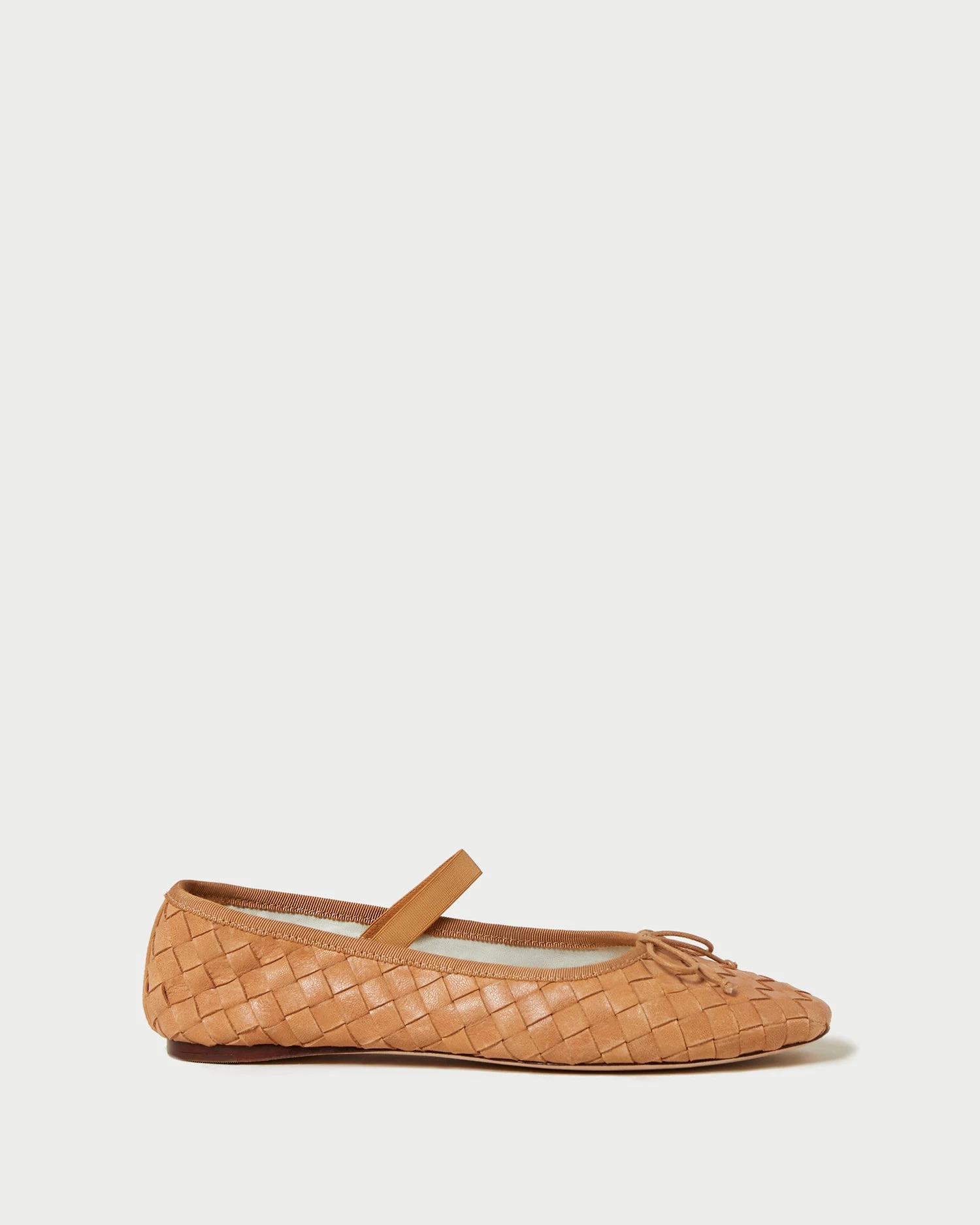 Soft ballet flat in honey tan woven leather with an elastic bridge strap and bow detail. Features a padded footbed with gold stamped logo and an almond toe.