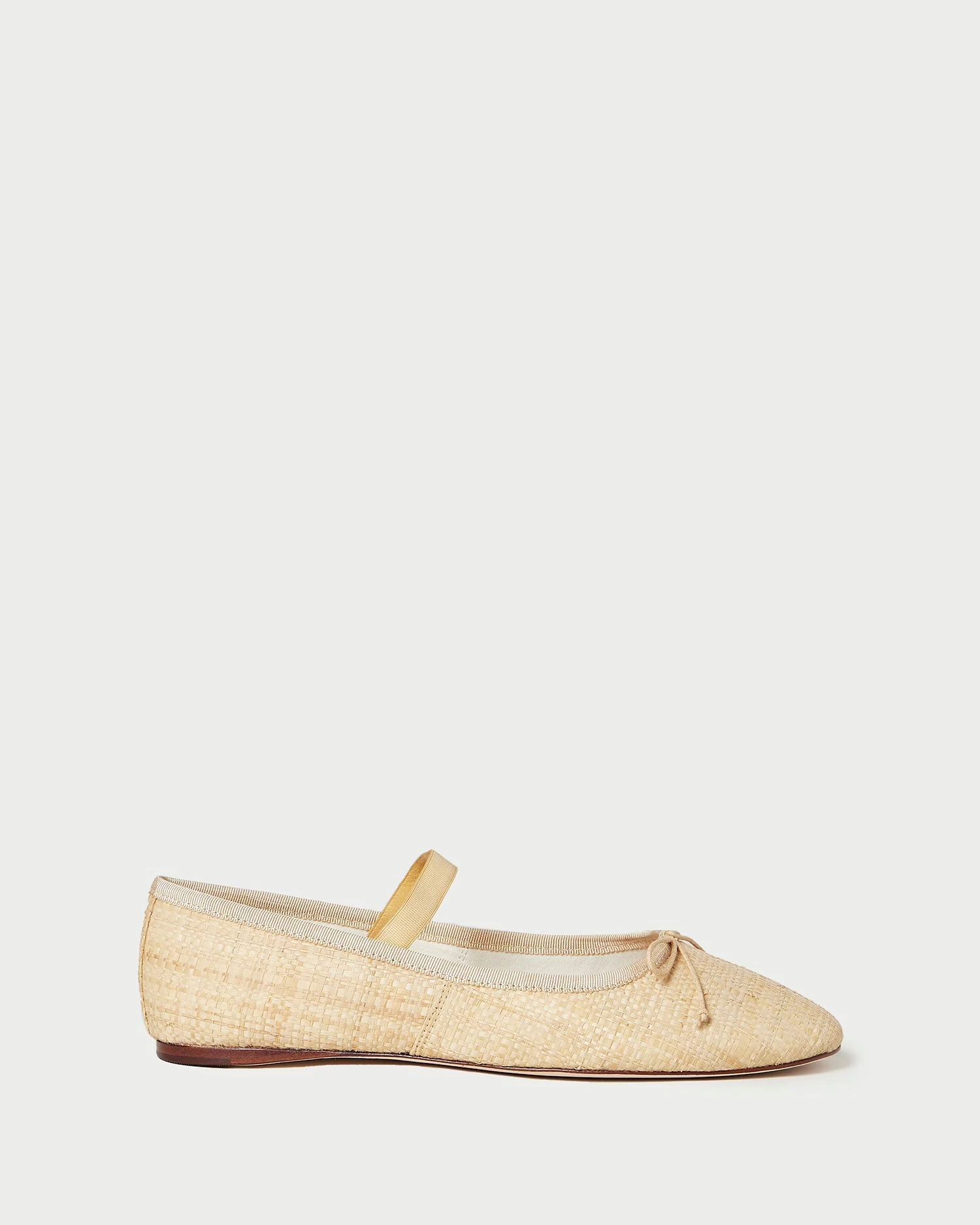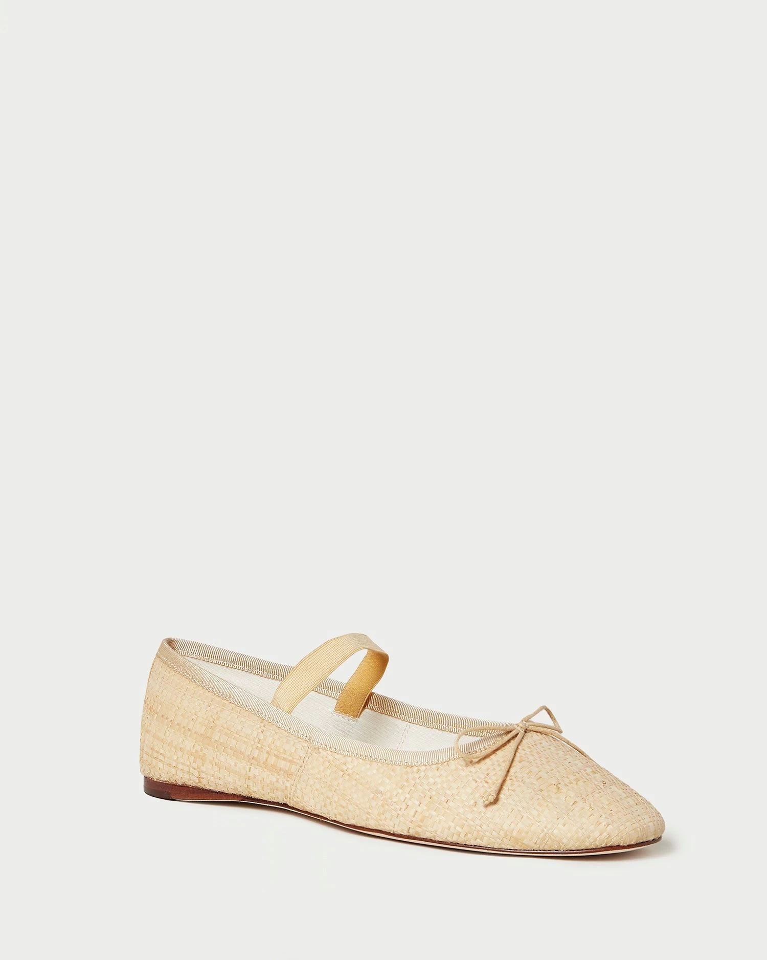 Soft ballet flat in natural raffia with an elastic bridge strap and bow detail. Features a padded footbed with gold stamped logo and an almond toe.