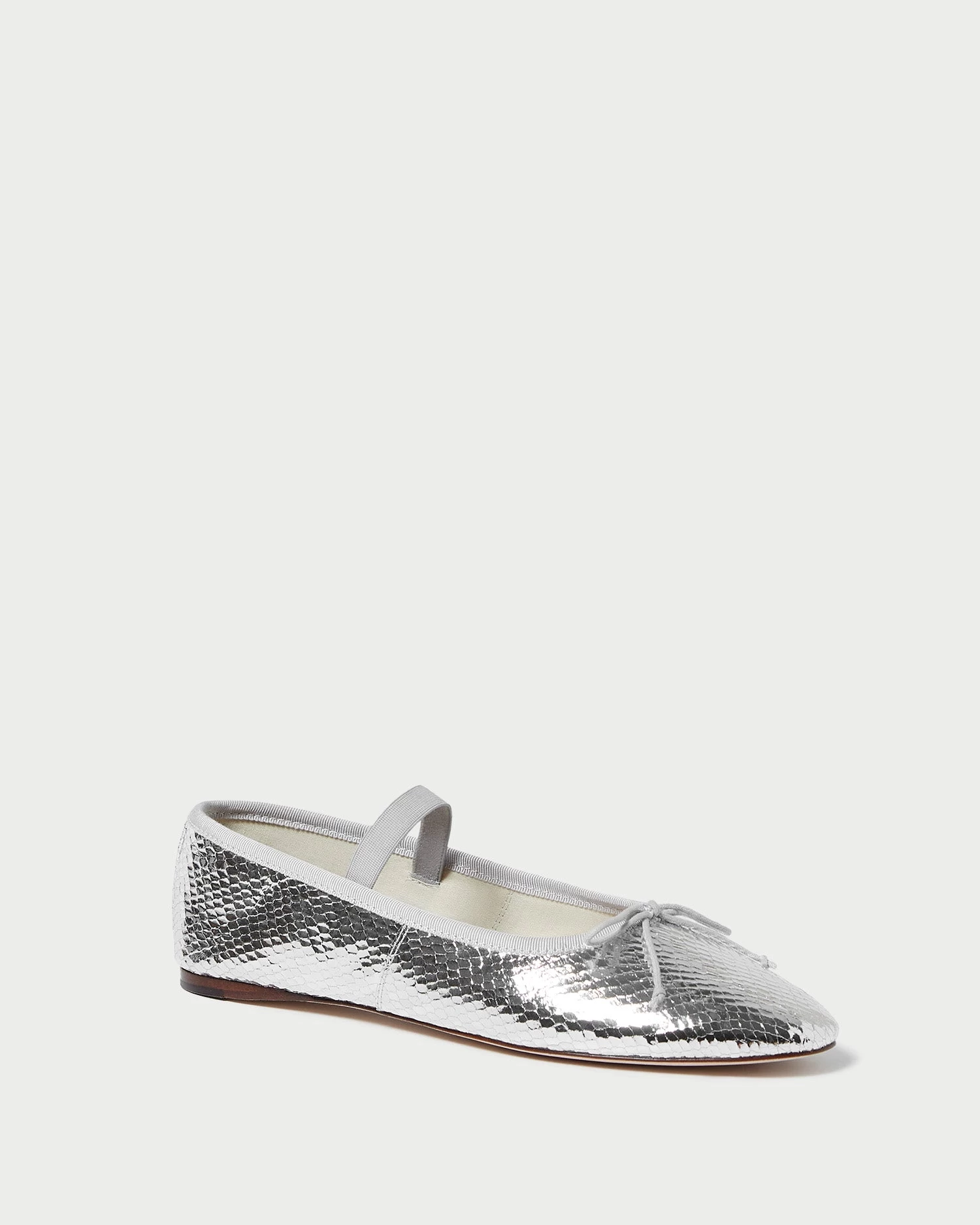 Soft ballet flat in silver Italian snake-embossed leather with an elastic bridge strap and bow detail. Features a padded footbed with gold stamped logo and an almond toe.