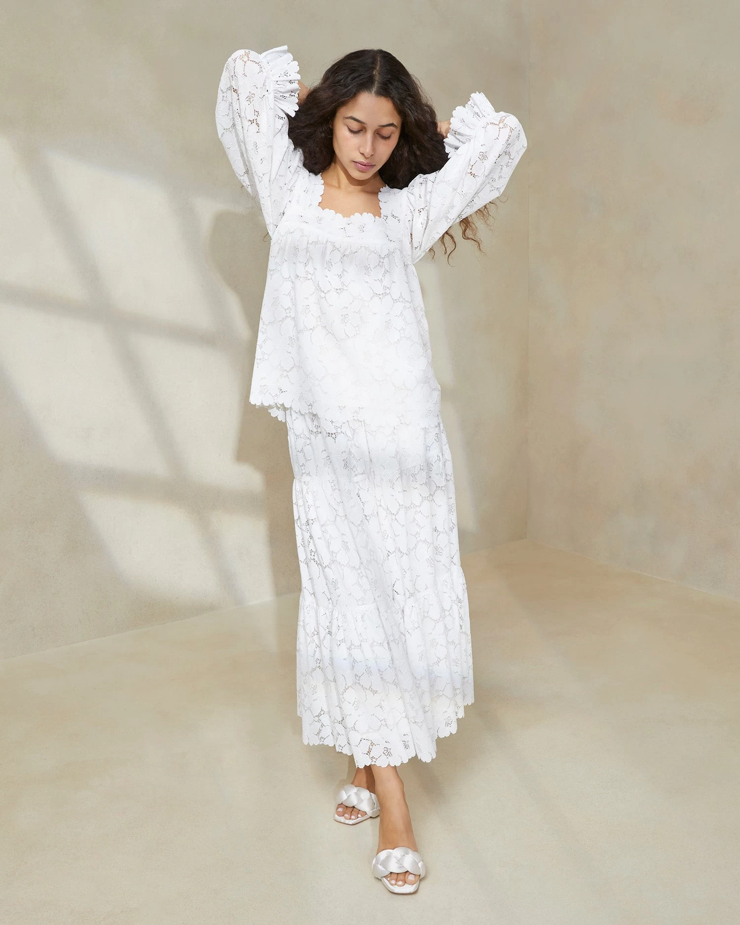 Square neck top in cream-colored lace. Features ruffled trim at the ends of the sleeves and scalloped detailing along the neckline.