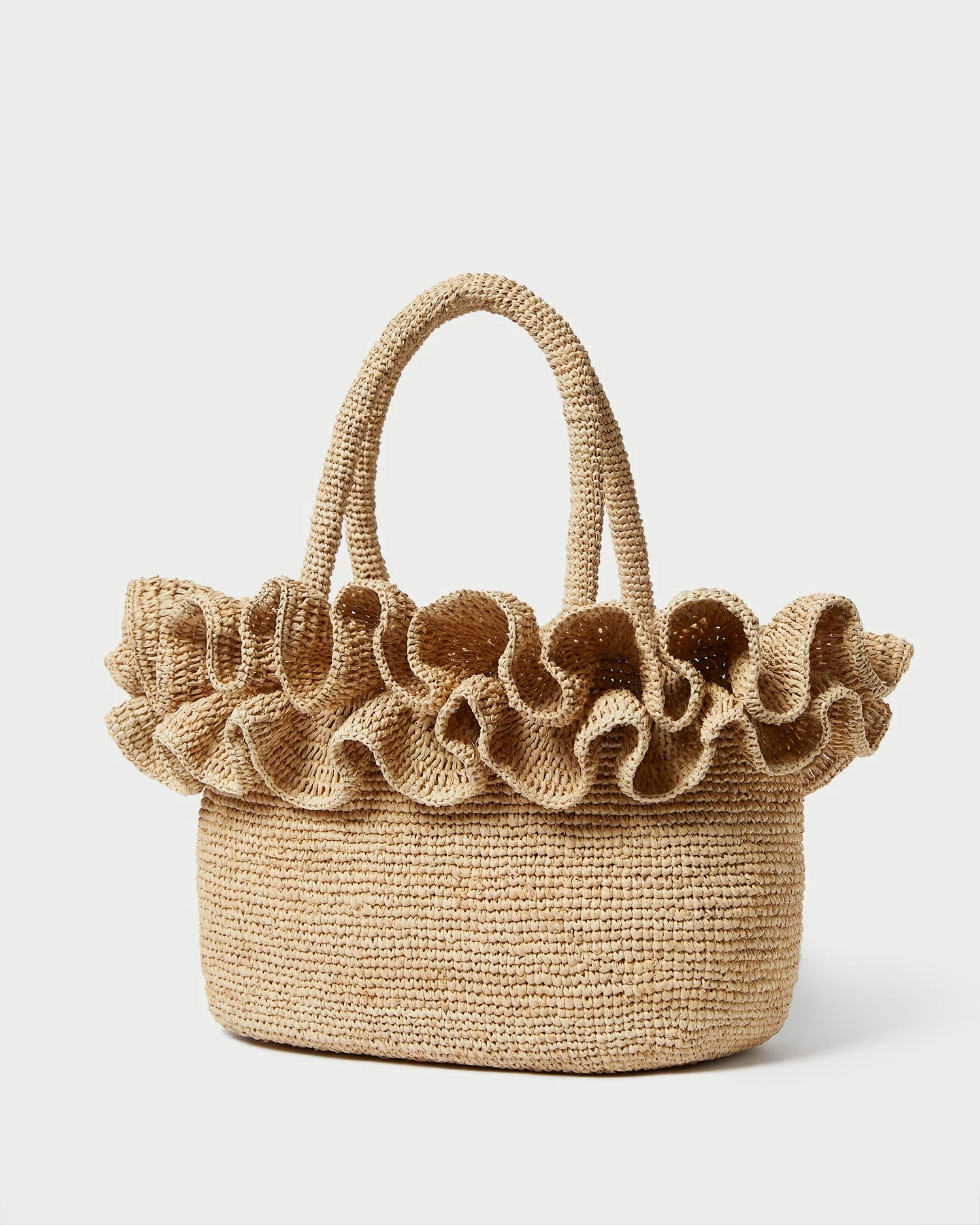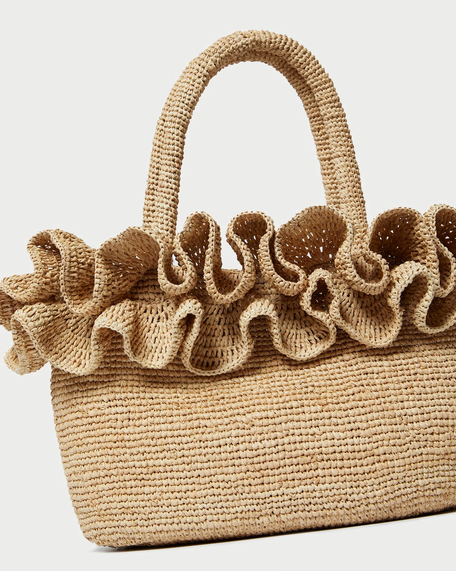 Tote bag with ruffled trim in natural raffia. Features raffia straps and a magnetic closure.