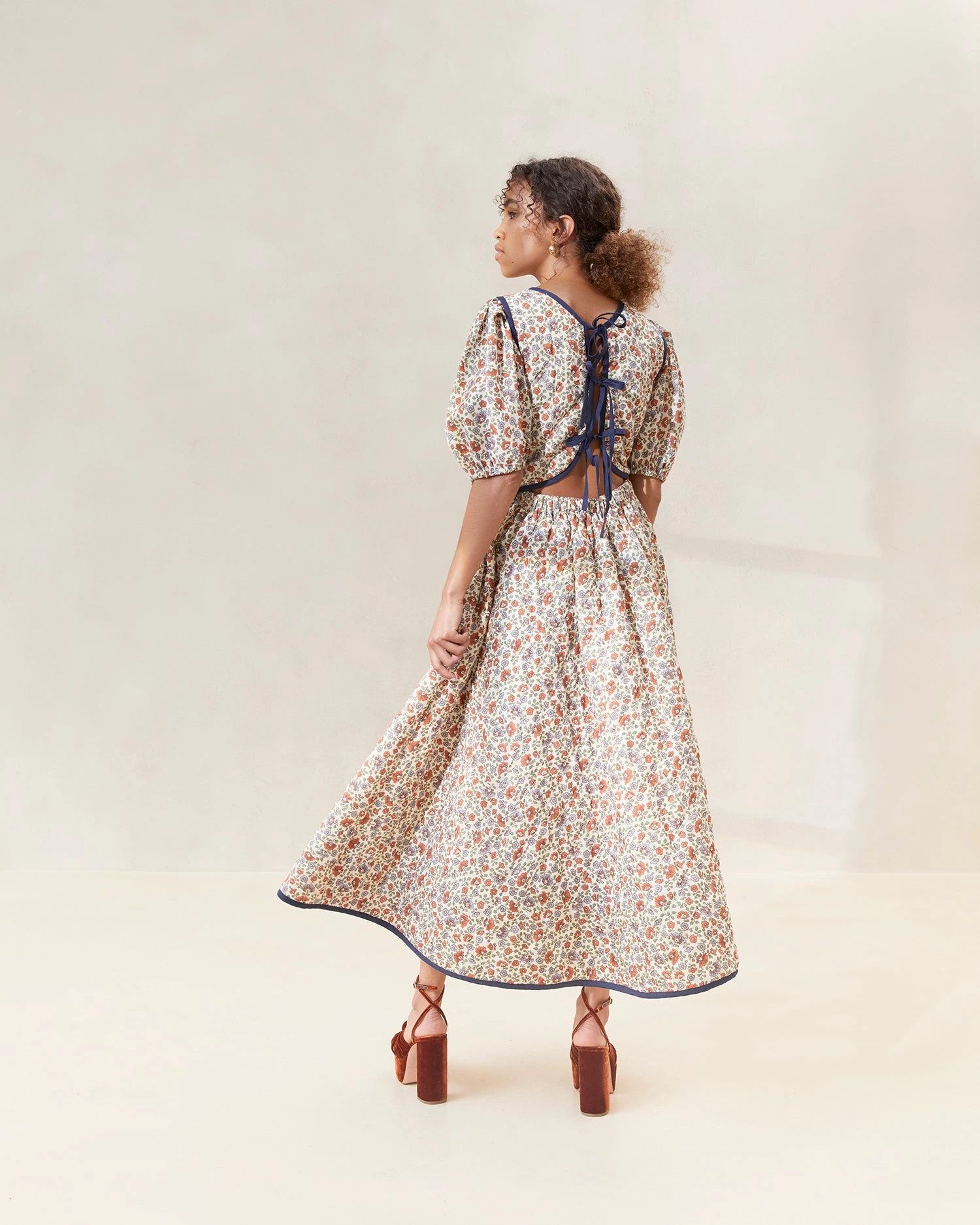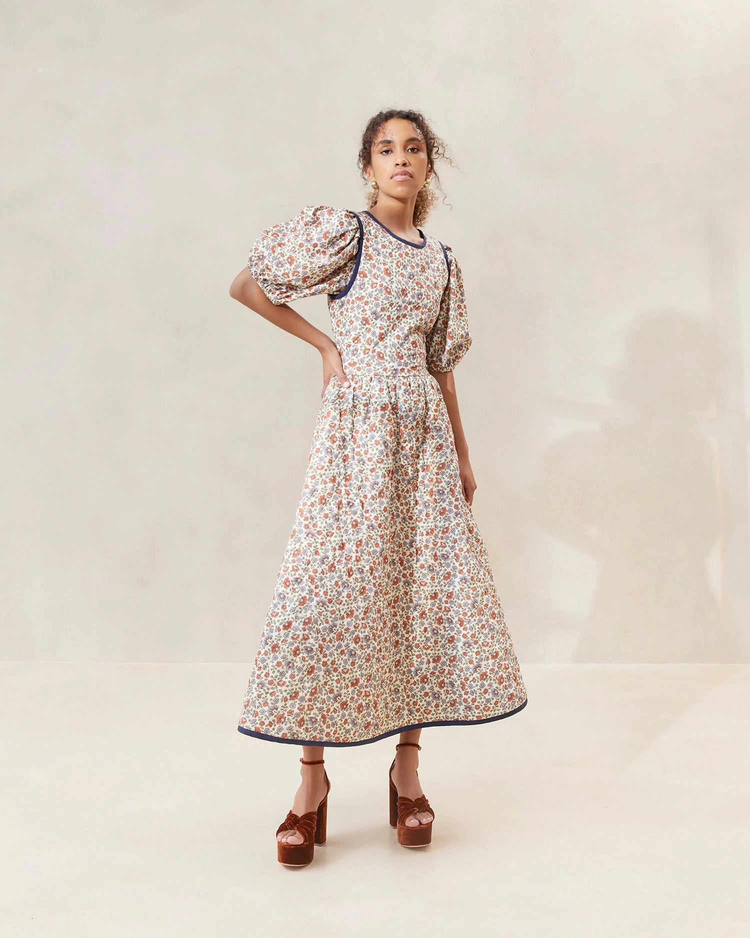 Long dress in cream folk floral cotton. Features a quilted texture, puff sleeves, and navy trim. Fitted at the bodice and flows out at the hips. Closes with ties at the back for an airy feel and feminine look.