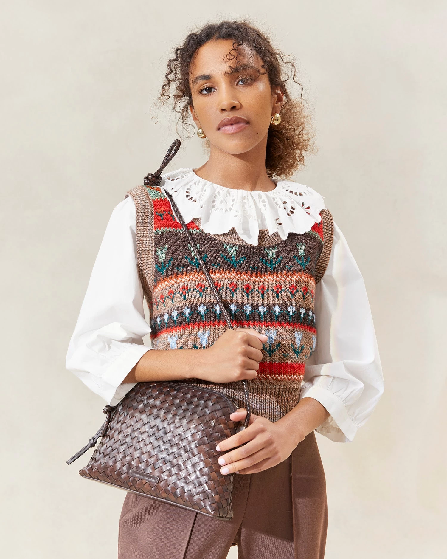 Crossbody bag in chocolate brown woven leather. Features a zipper closure, cotton lining, interior pocket, and gold stamped logo.