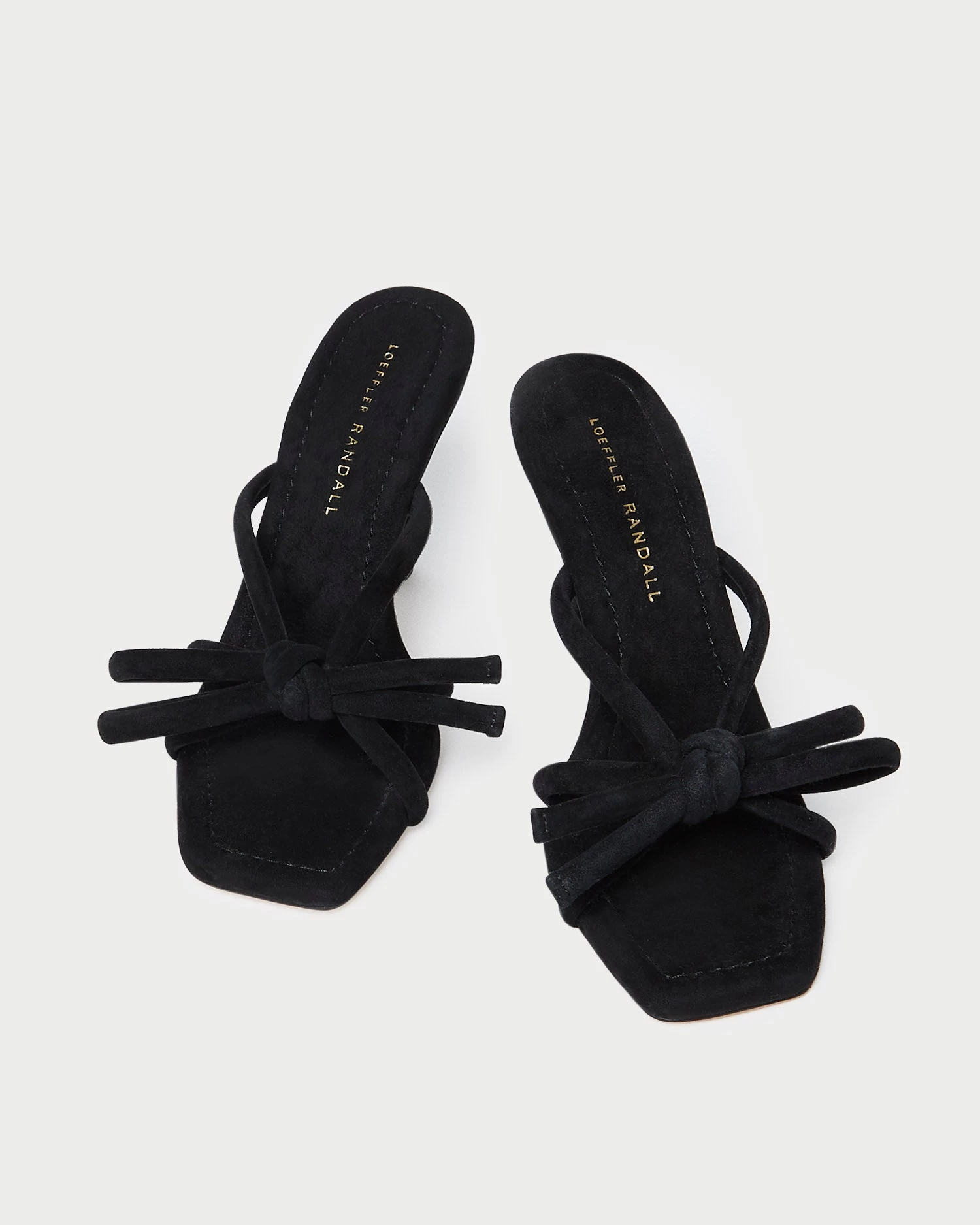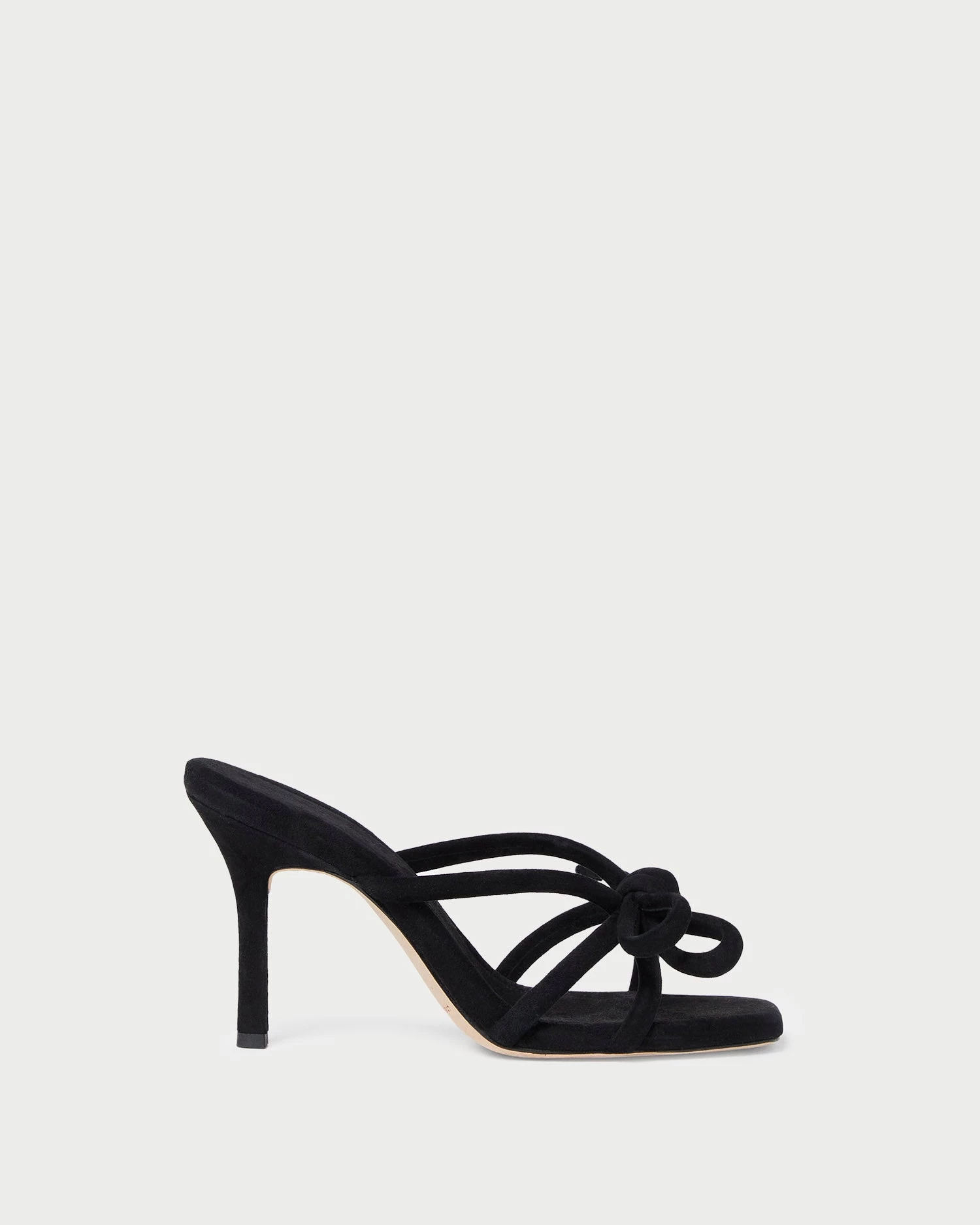 Heeled sandal with knotted-bow detail in black suede. Features a padded footbed with gold stamped logo and an open, squared toe. 3.5-inch heel.