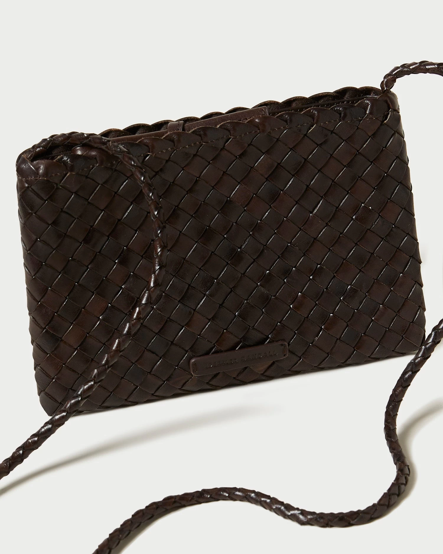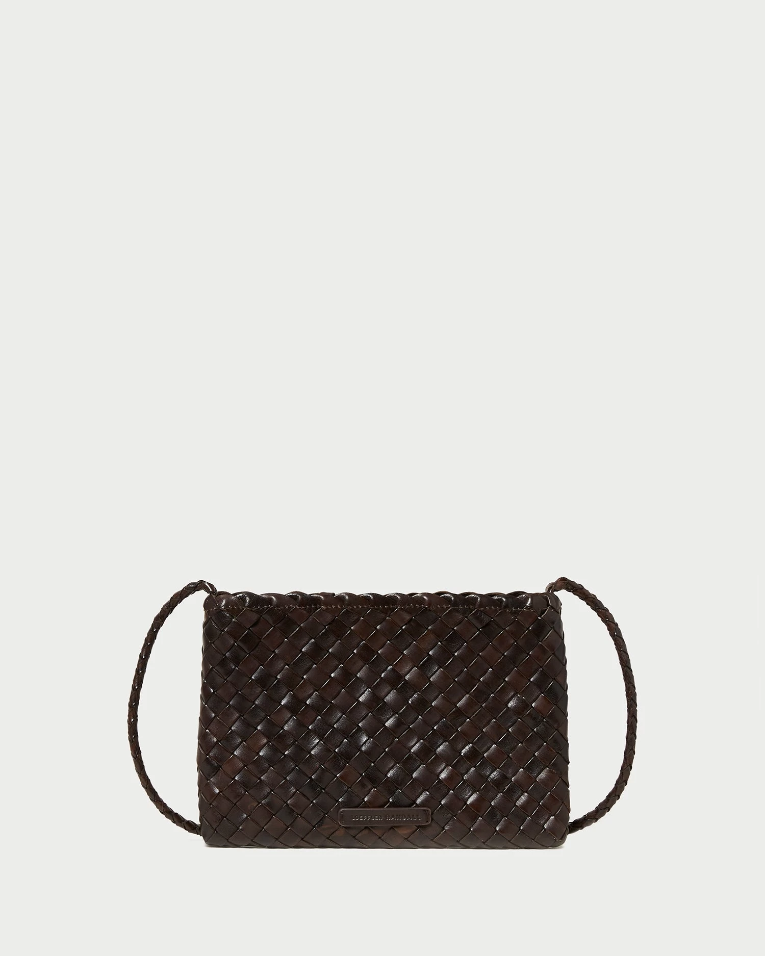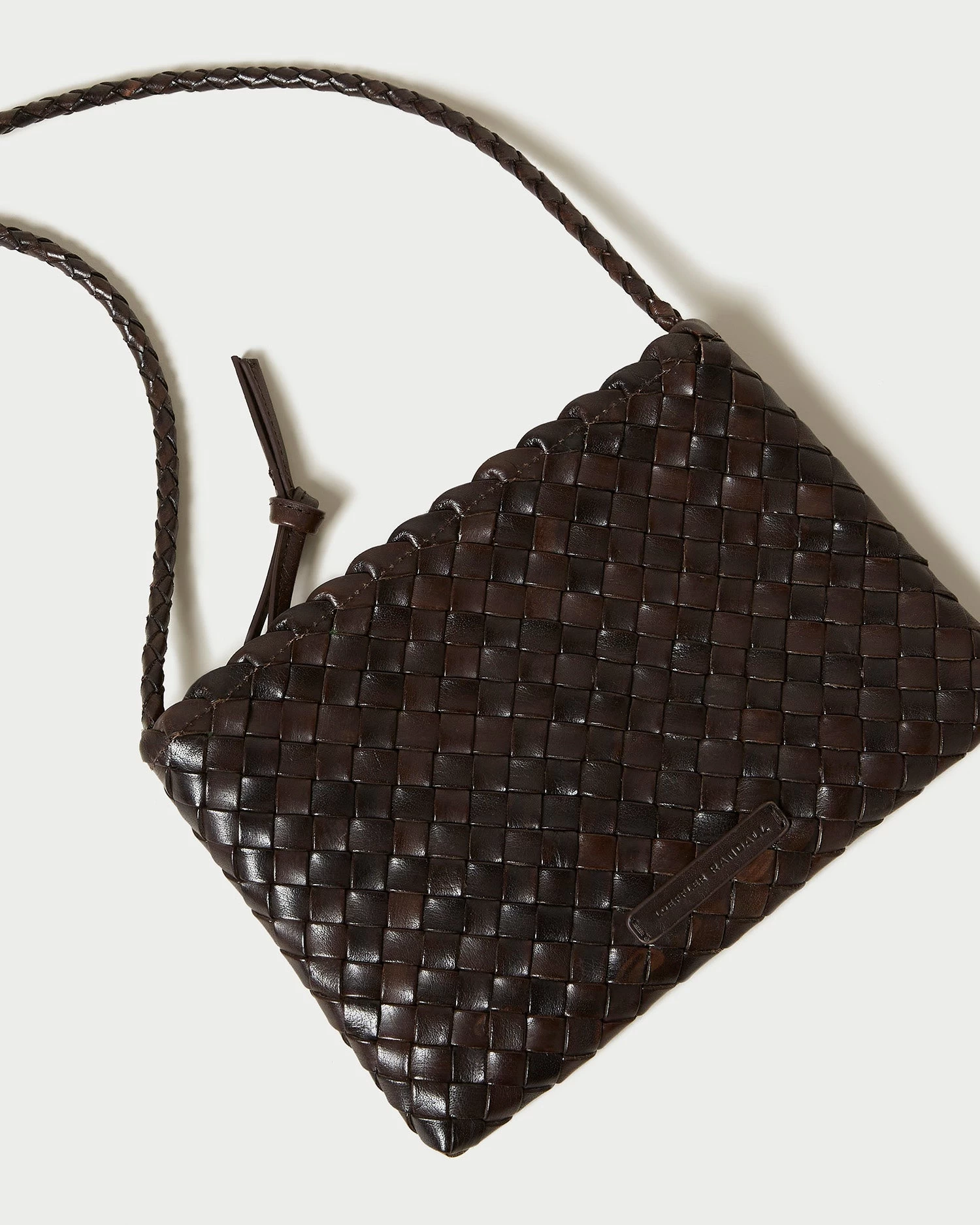 Small crossbody in chocolate brown woven leather. Features a zipper closure and cotton lining.