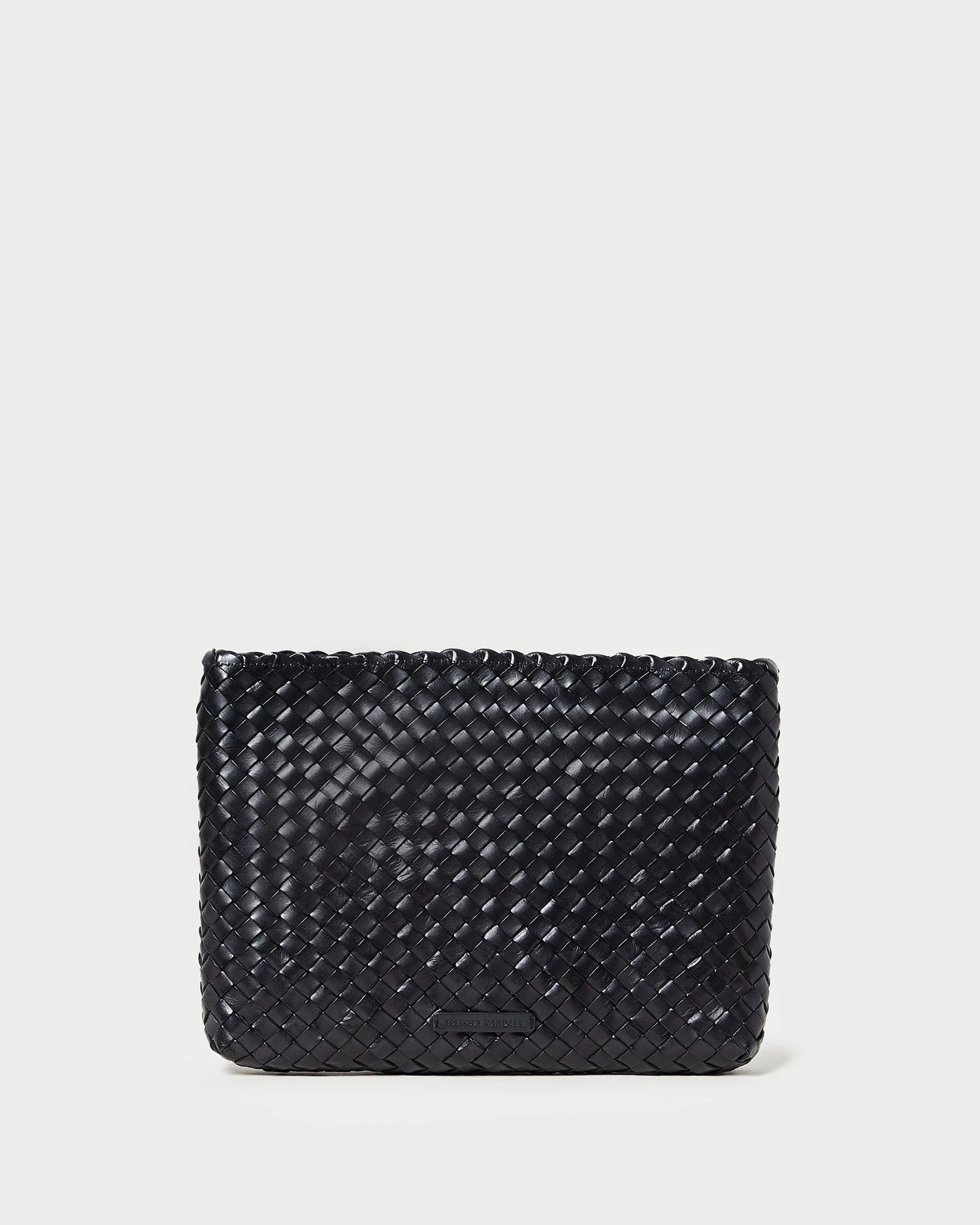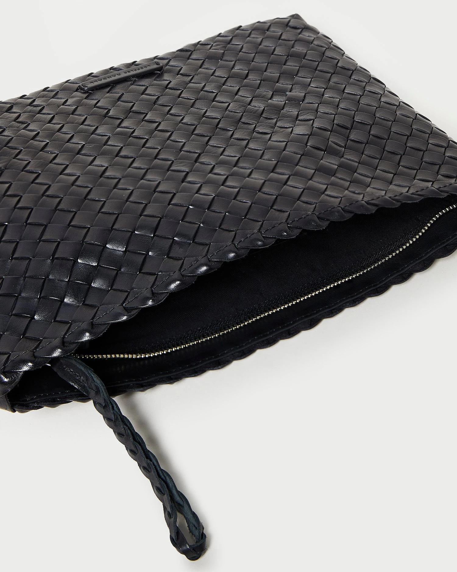 Flat clutch in black woven leather featuring a top zip closure, full lining, and inside card slot.