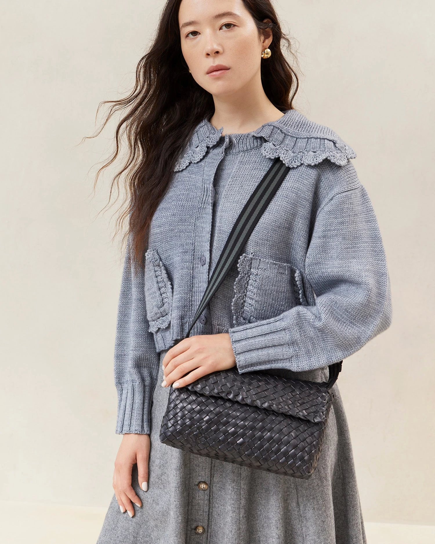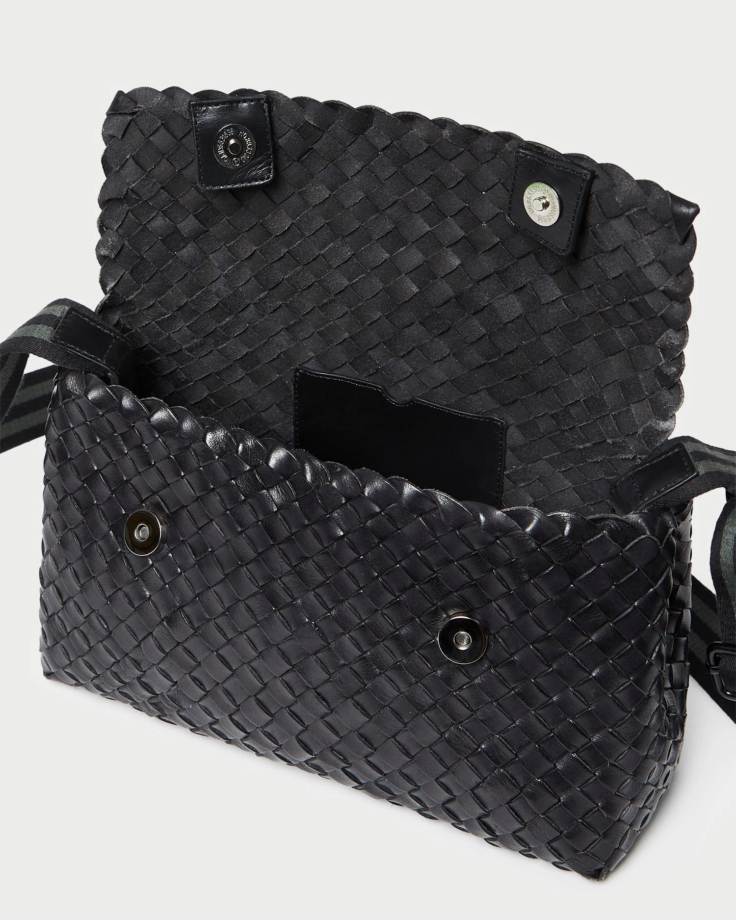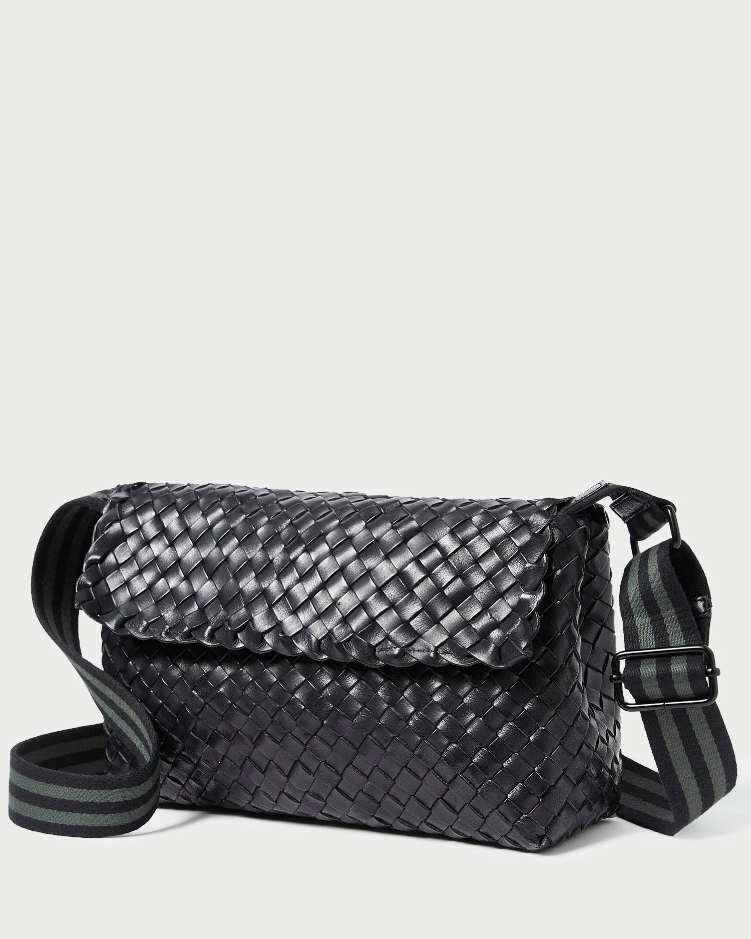 Shoulder bag in black woven leather. Features a comfortable black and green stripe cotton webbing strap and magnetic closure.