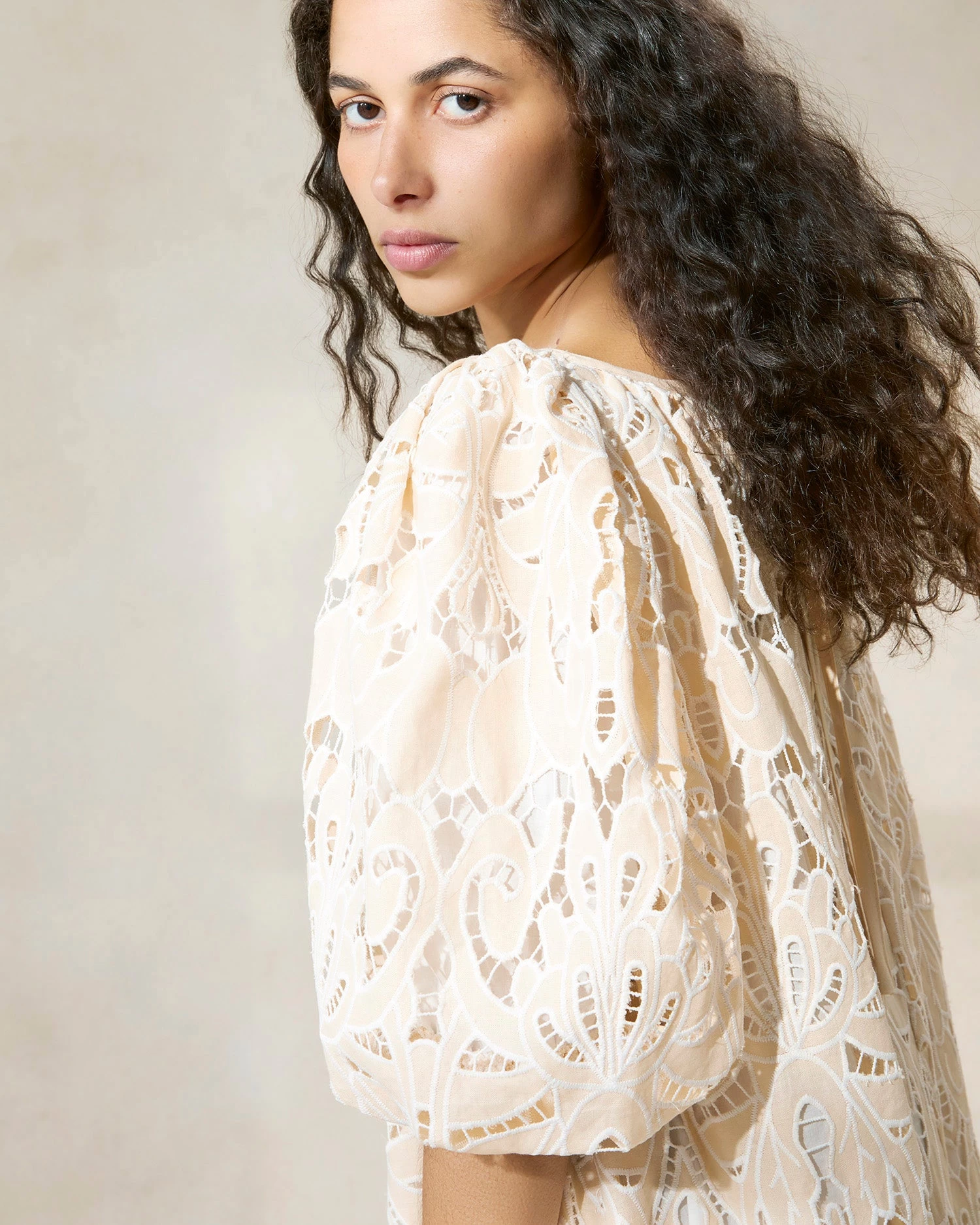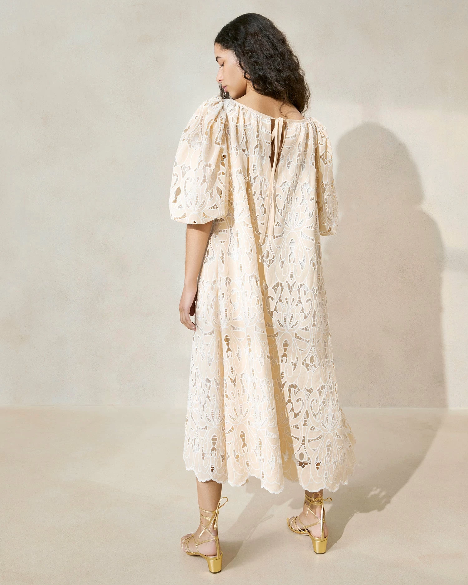 Oversized flowy dress in tan lace. Features puffy sleeves, pockets, and light gathering at the rounded neckline. Closes with a tie detail at the back neck.