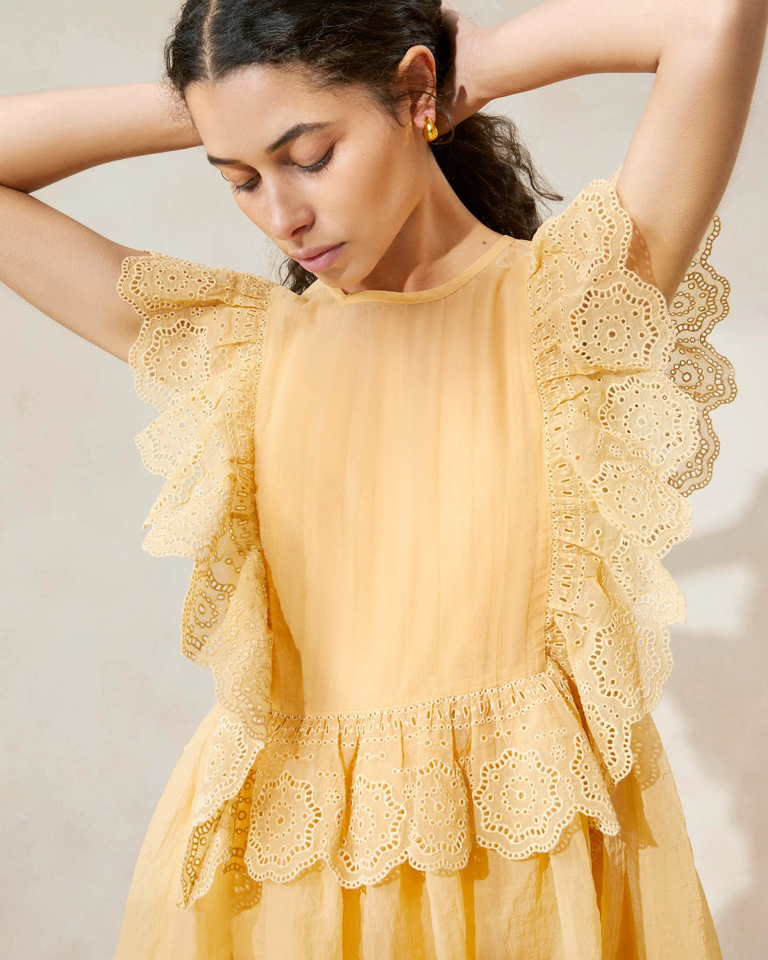 Midi dress in dune beige Italian organza. Features eyelet lace ruffled trim. Closes with a zipper and button at the back.