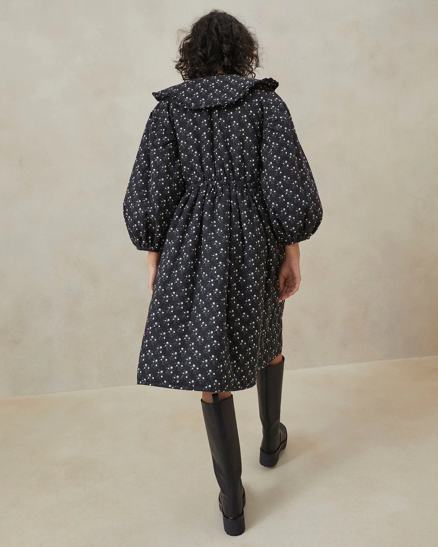 Coat dress in black ditsy floral cotton. Features puffed sleeves, a ruffle-edged collar, and buttons down the length of the front. There is also an adjustable drawstring at the waist, allowing for either a more boxy or fitted shape, depending on preference.