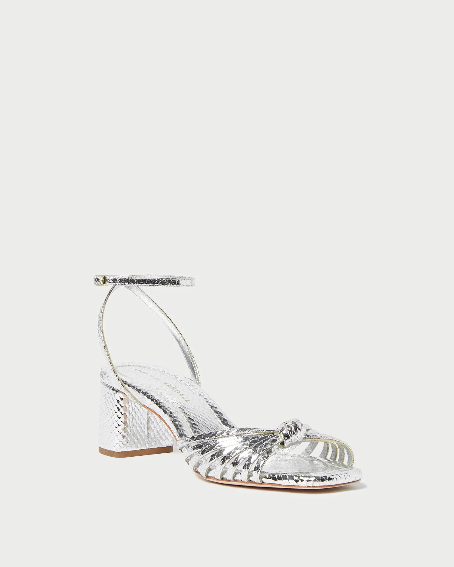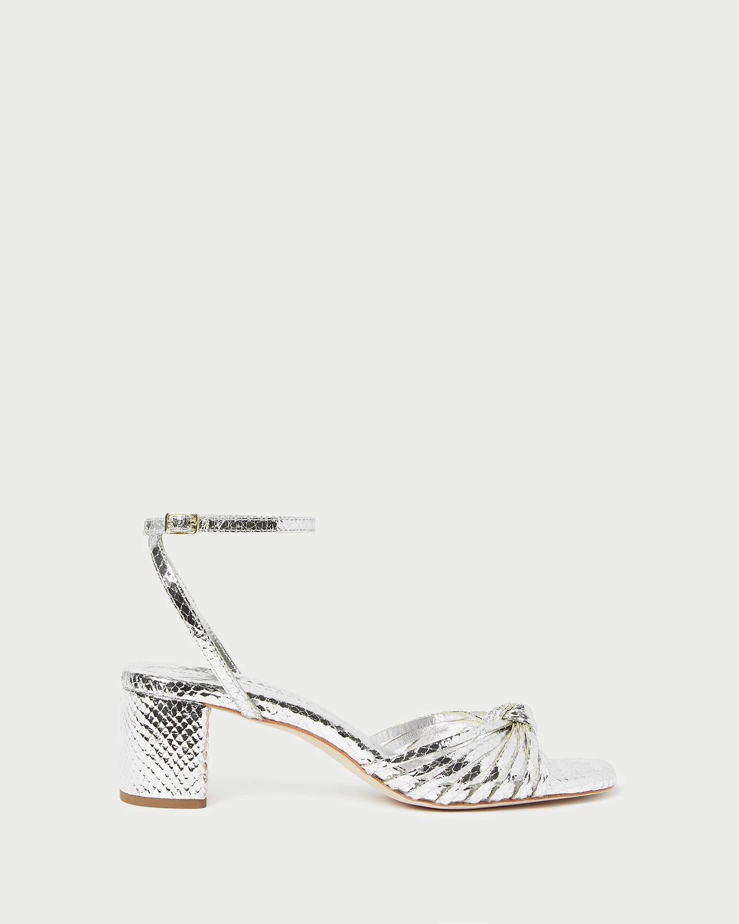 Knotted mid-heel sandal in metallic silver snake-embossed Italian leather with a pieced mignon upper. Features a tonal sole, an open toe, and an adjustable ankle strap. 2-inch heel.