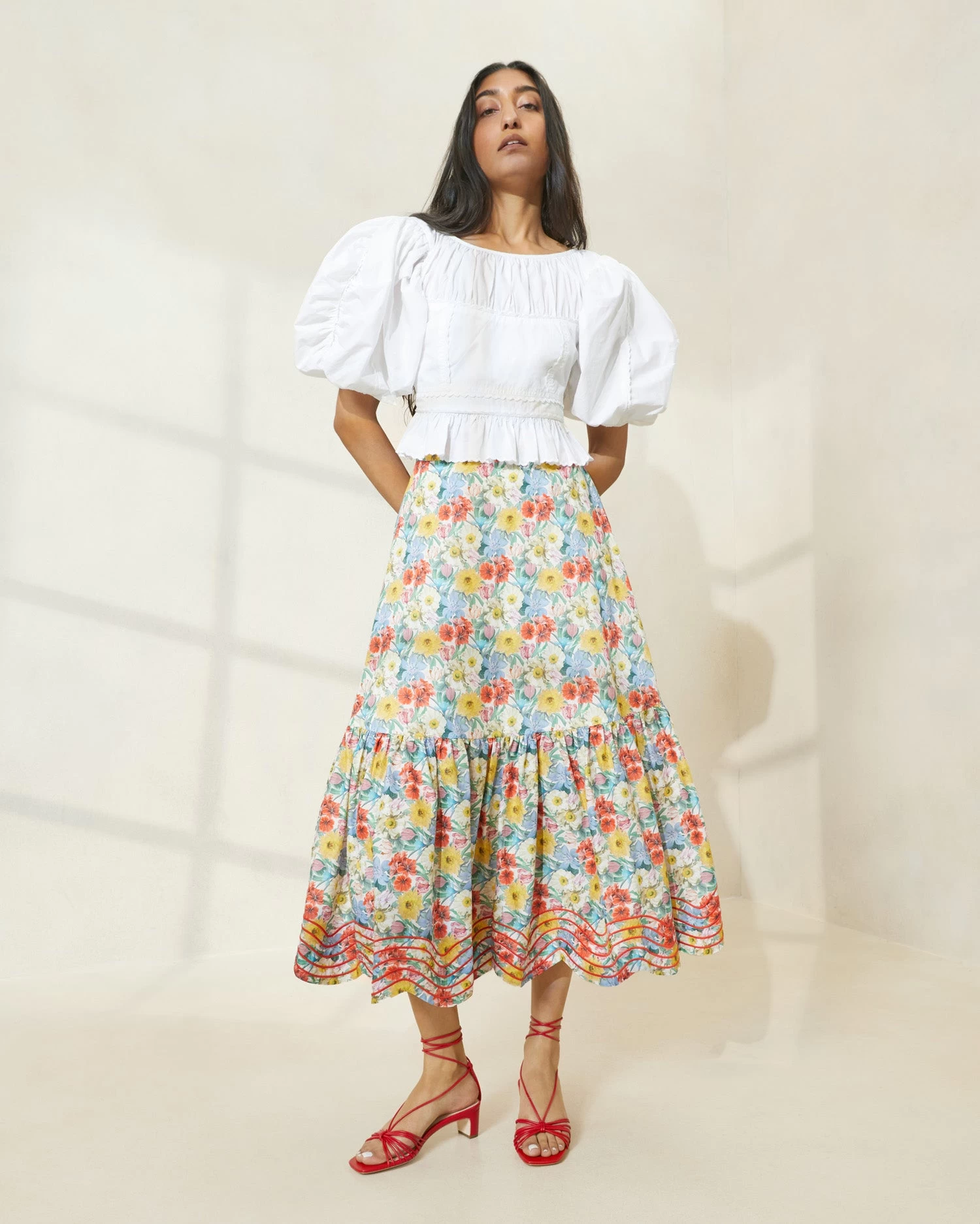 Long skirt in poppy red-based floral-print cotton. Features a fitted shape with a flared bottom. Zips closed with a concealed zipper at the left side.