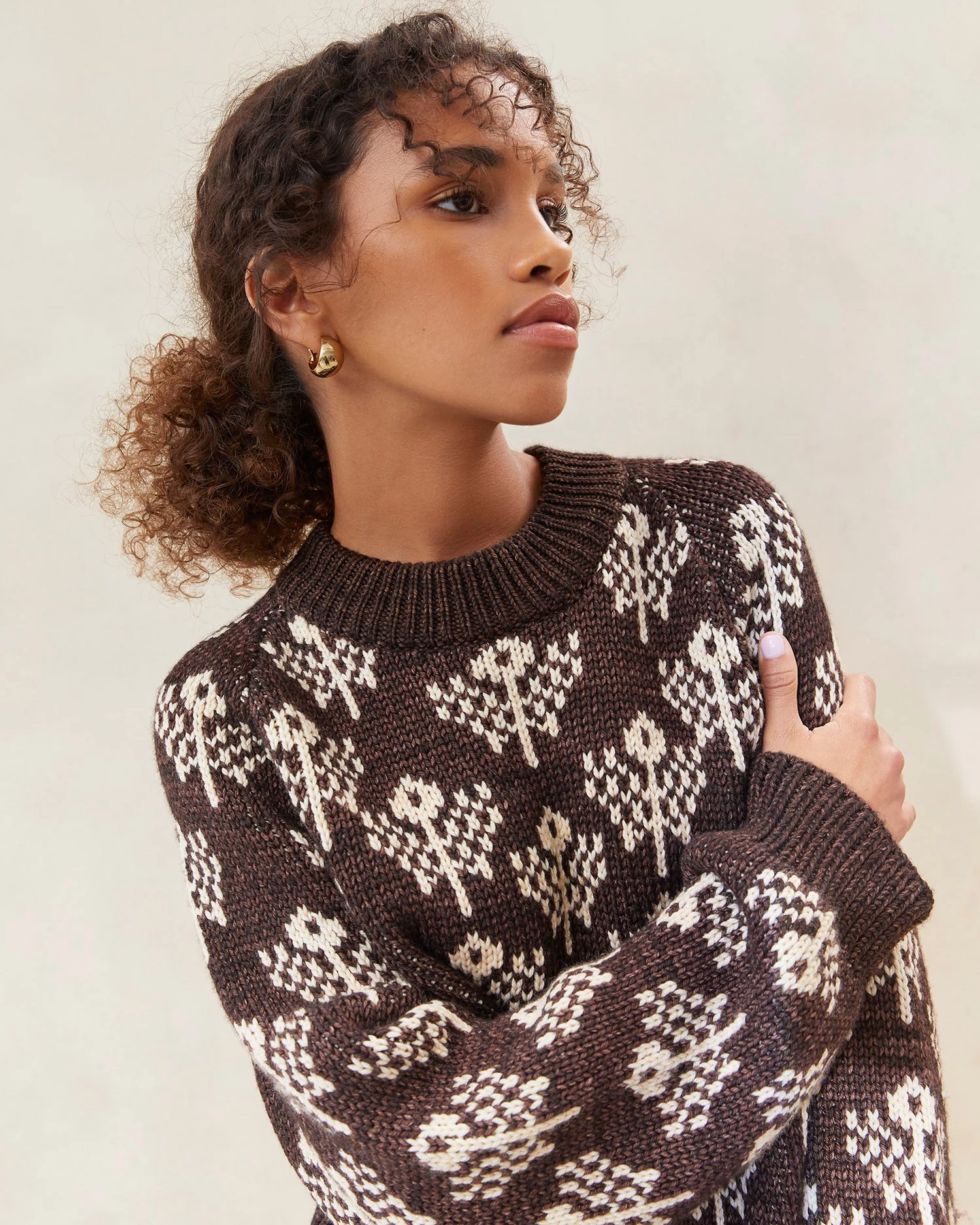 Crewneck sweater in brown and cream chunky-knit wool. Features an allover floral intarsia pattern and generous balloon sleeves. This sweater is 100% Andean Highland wool made in Peru by a collective of knitters whose work provides support to women and children living in poverty on an island called Amantani on Lake Titicaca.