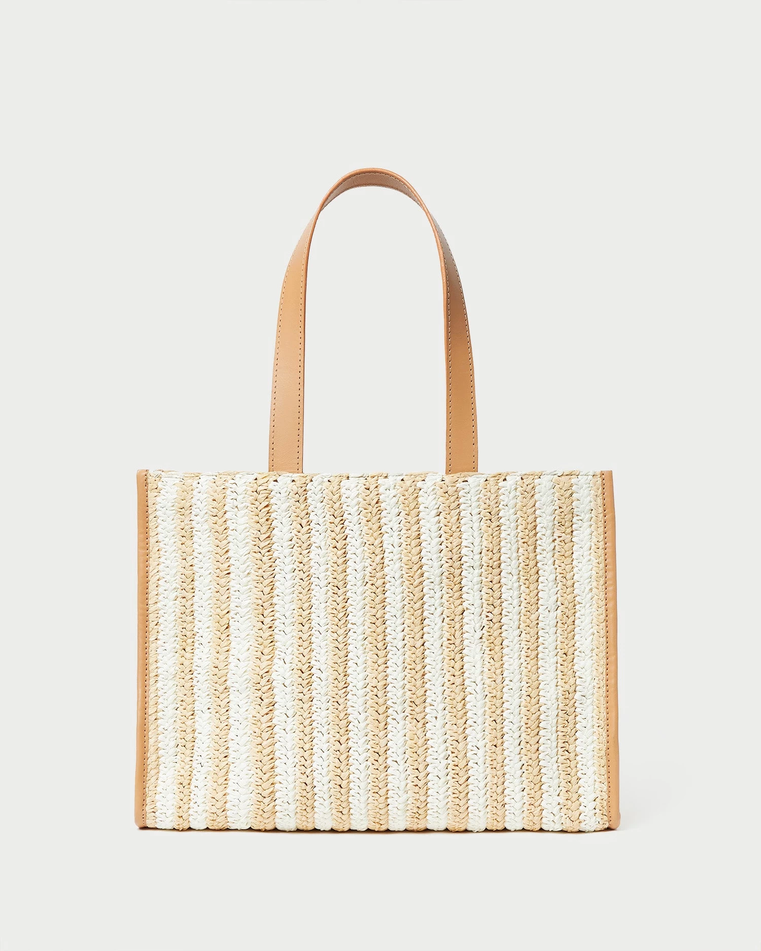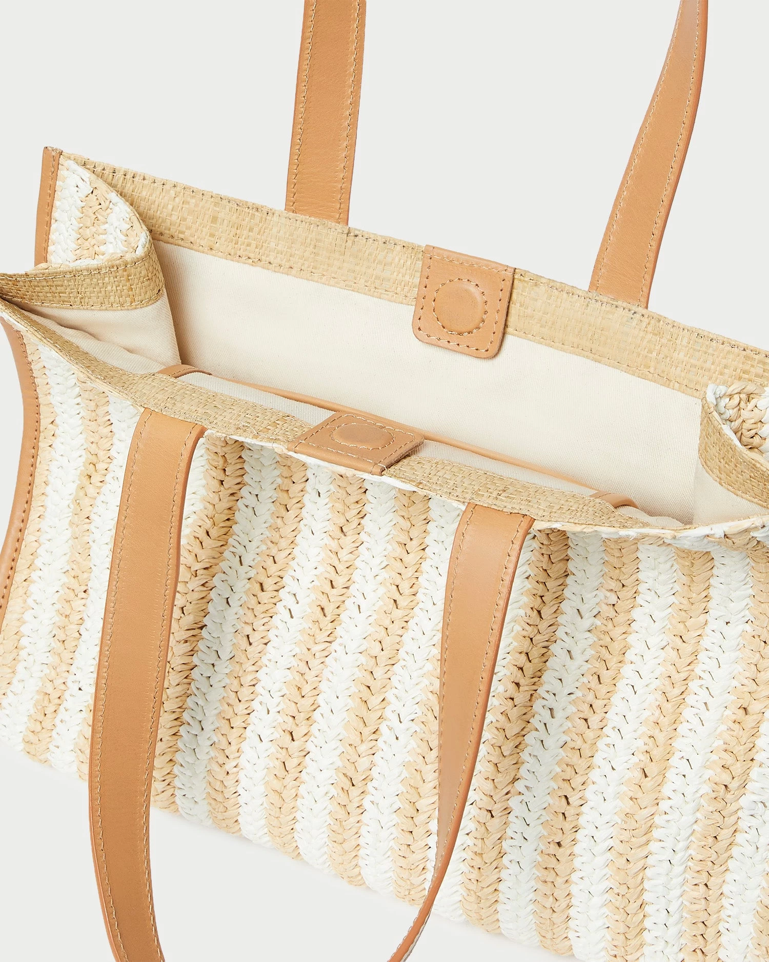 Tote in white and natural crocheted raffia. Features natural leather straps, a magnetic closure, a full lining, and an interior flap pocket.