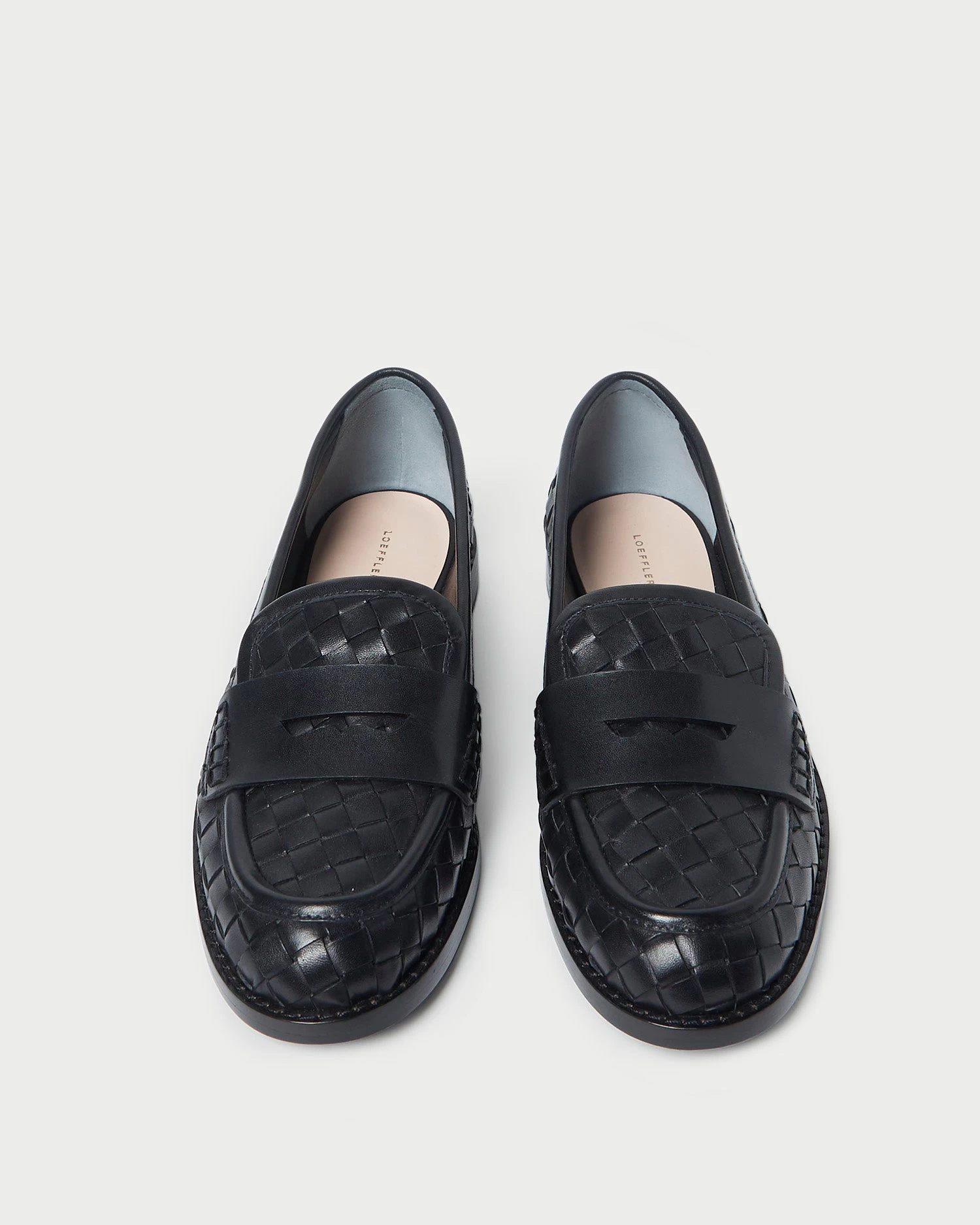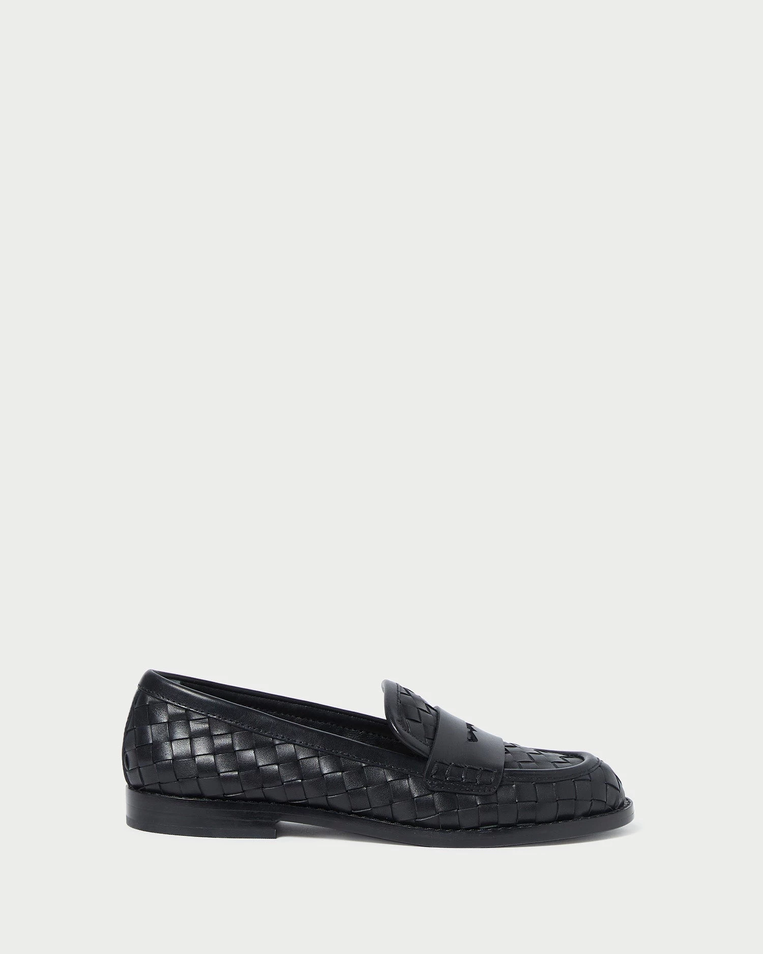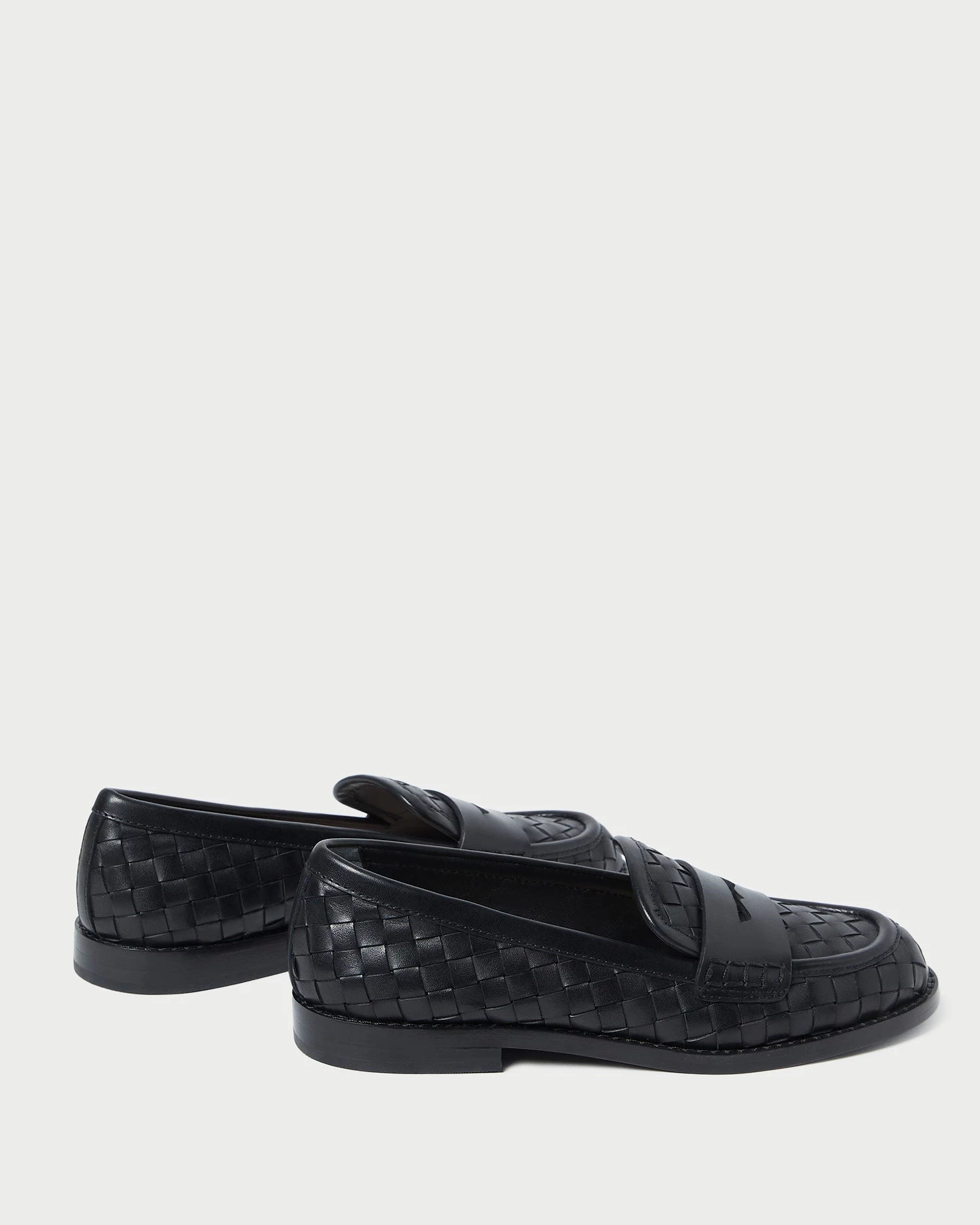 Penny loafer in woven black Italian leather. Features a padded leather footbed with gold stamped logo, a round toe, and a slip-on design. 0.75-inch heel.