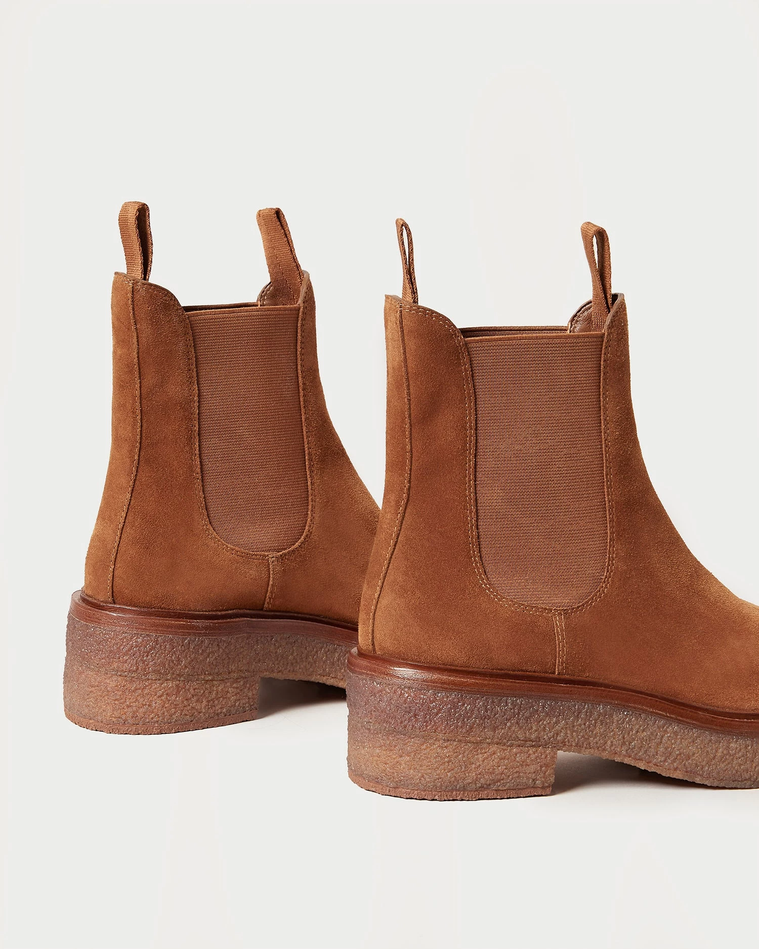Crepe sole bootie with elastic ankle panels in cacao brown Italian split suede. Features a padded footbed, round toe, and pull-on design. 1 inch heel.