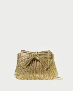 Pleated frame clutch in oro Italian lamé topped with our signature knotted bow. Features a removable twisted gold chain crossbody strap, frame closure, full lining, and gold stamped logo.