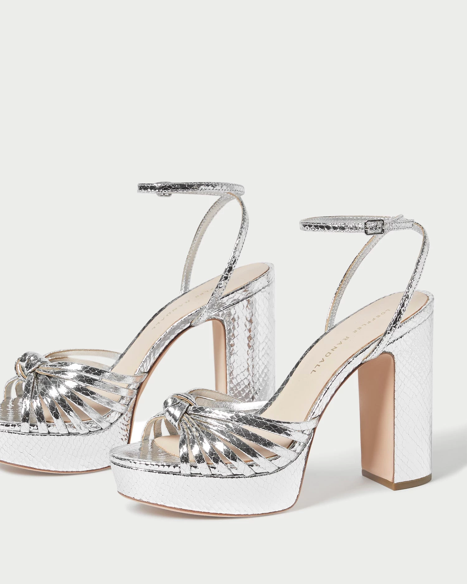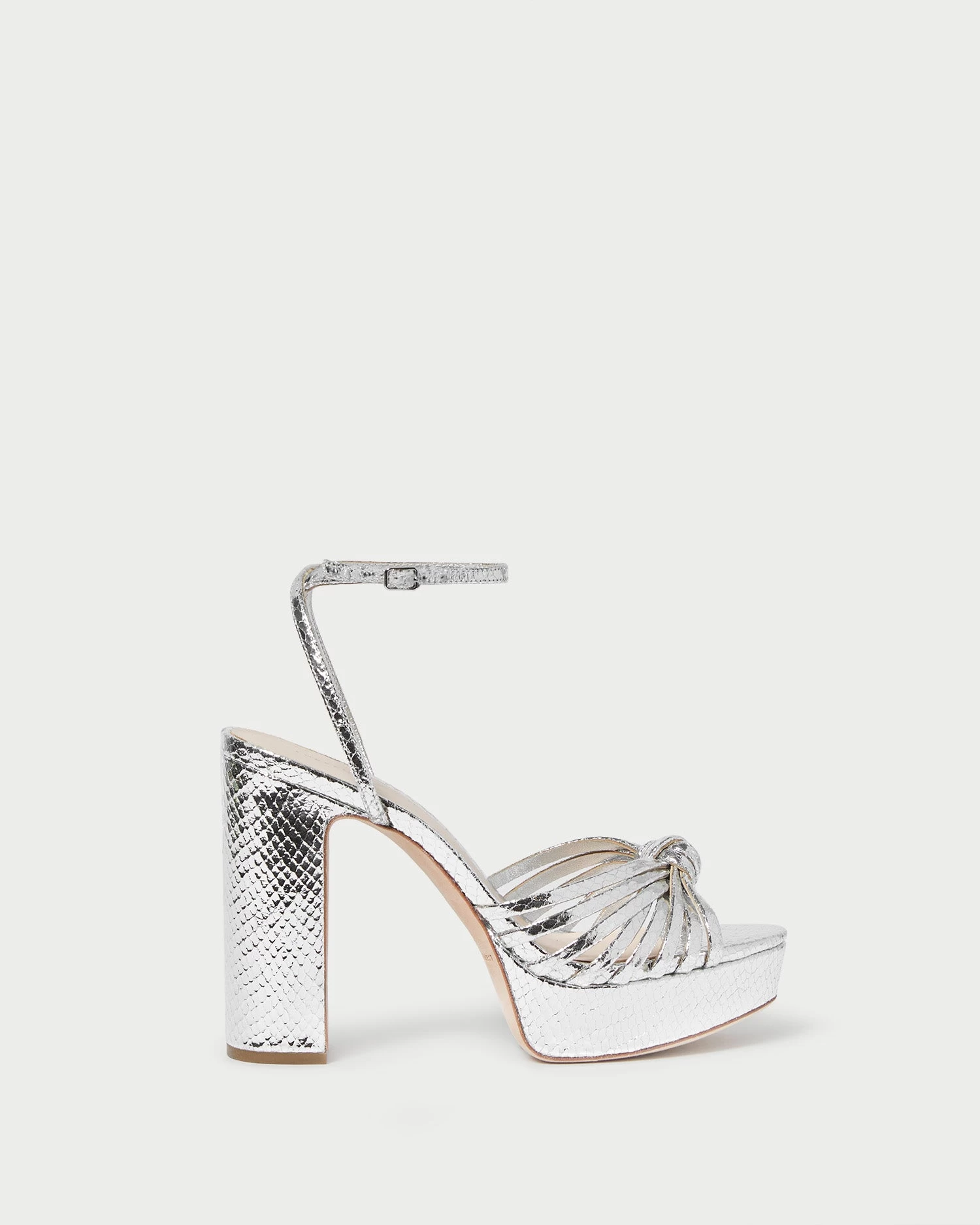 Knotted, heeled platform sandal in silver snake-embossed leather with a pieced mignon strap. Features a covered leather platform, an open toe, and an adjustable buckle ankle strap. 5-inch heel, 3.5-inch platform.