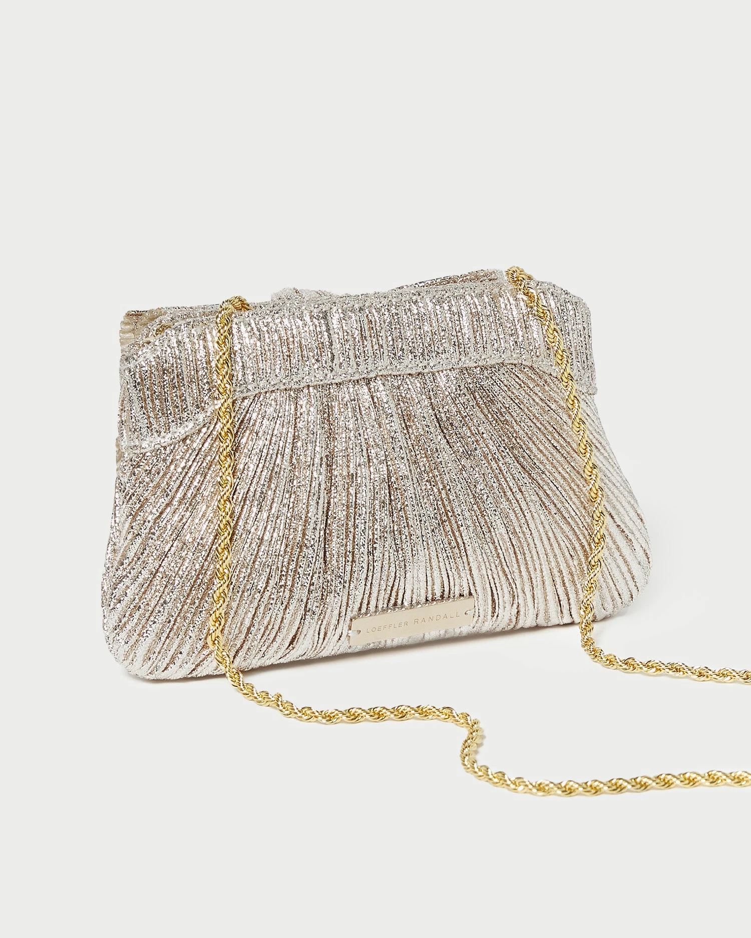 Mini pleated frame clutch with signature bow detail in champagne-hued Italian lamé. Fully lined with a removable twisted gold metal chain strap.