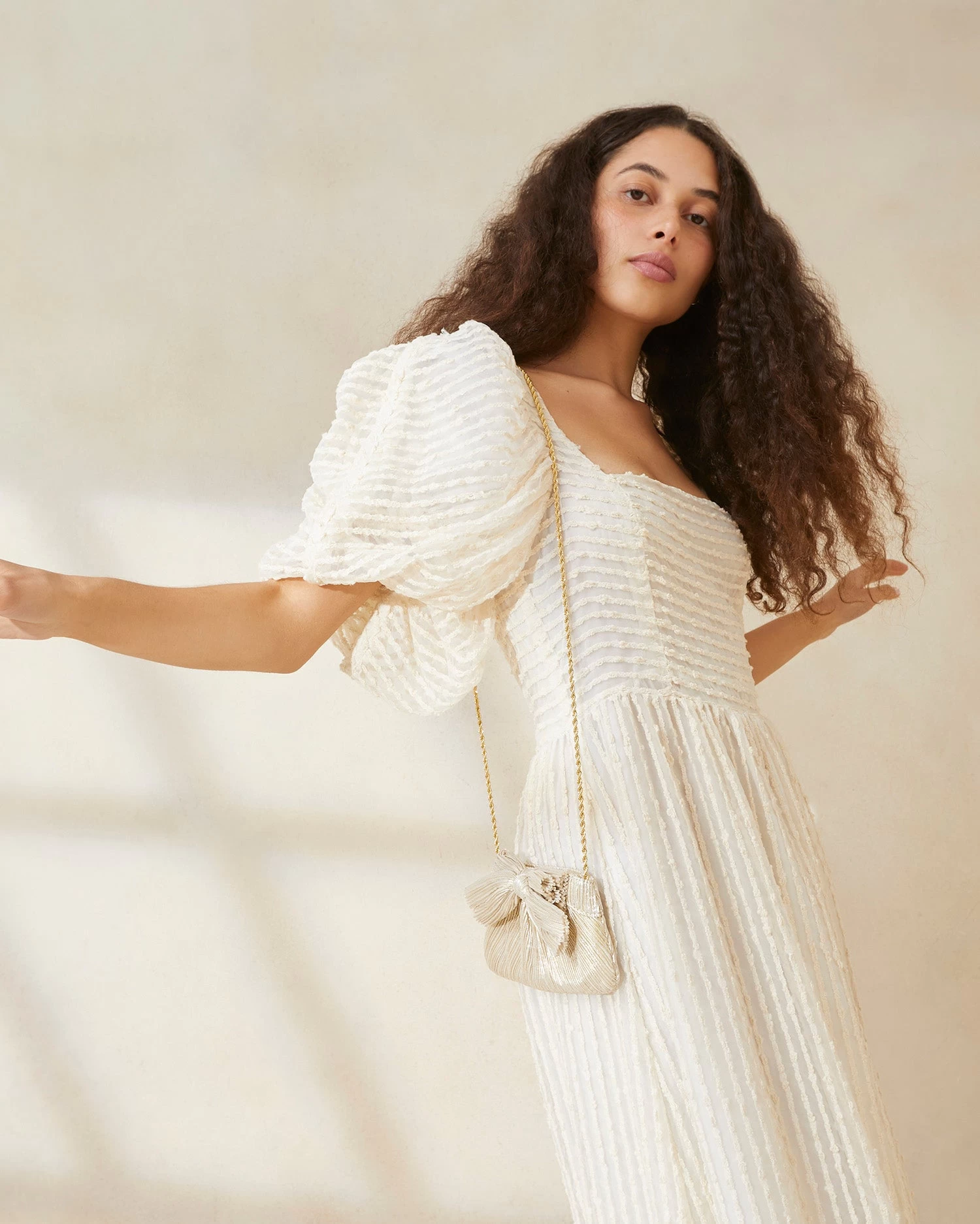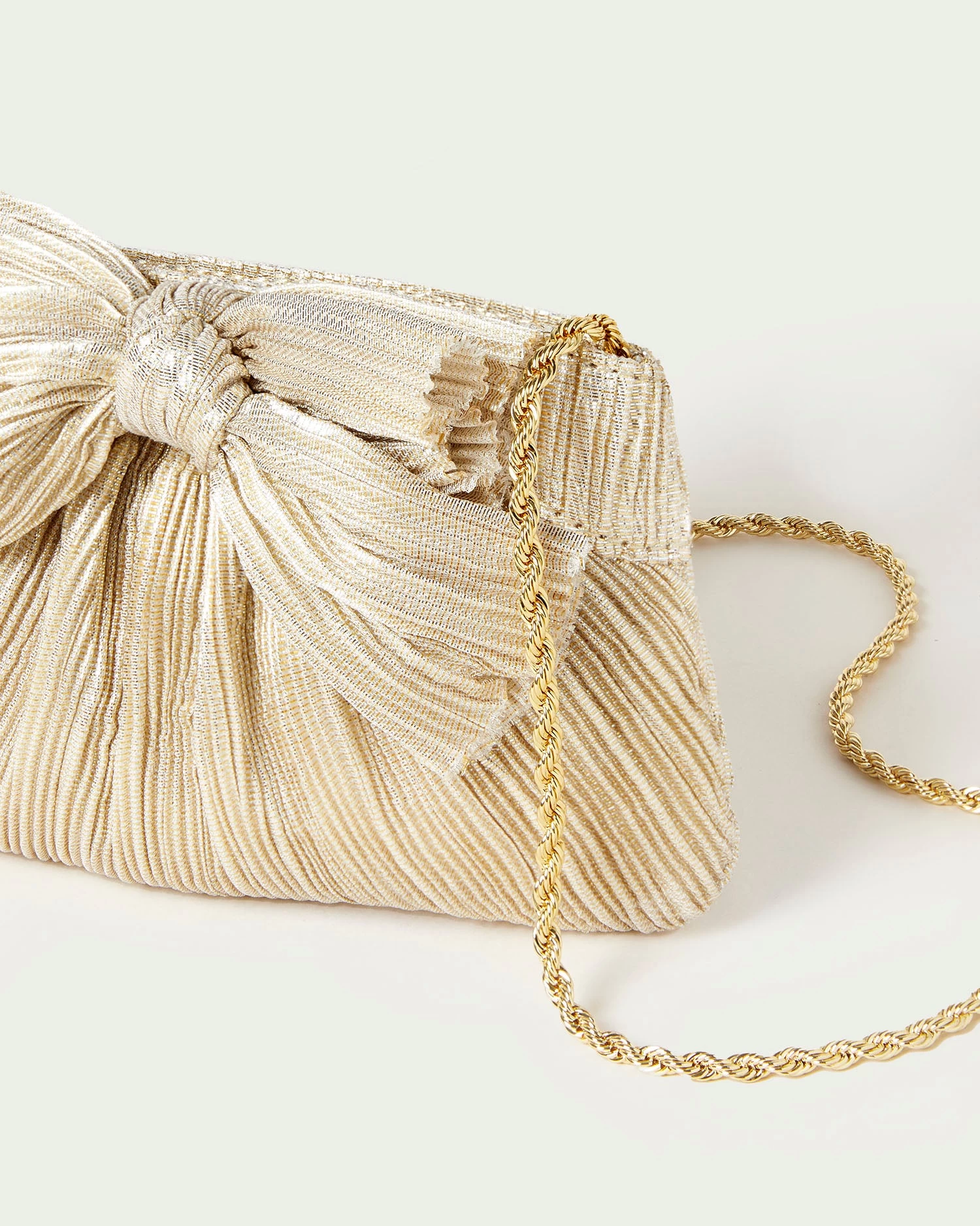 Mini pleated frame clutch with signature bow detail in platinum metallic lamé. Features a removable twisted gold chain crossbody strap, frame closure, full lining, and gold stamped logo.