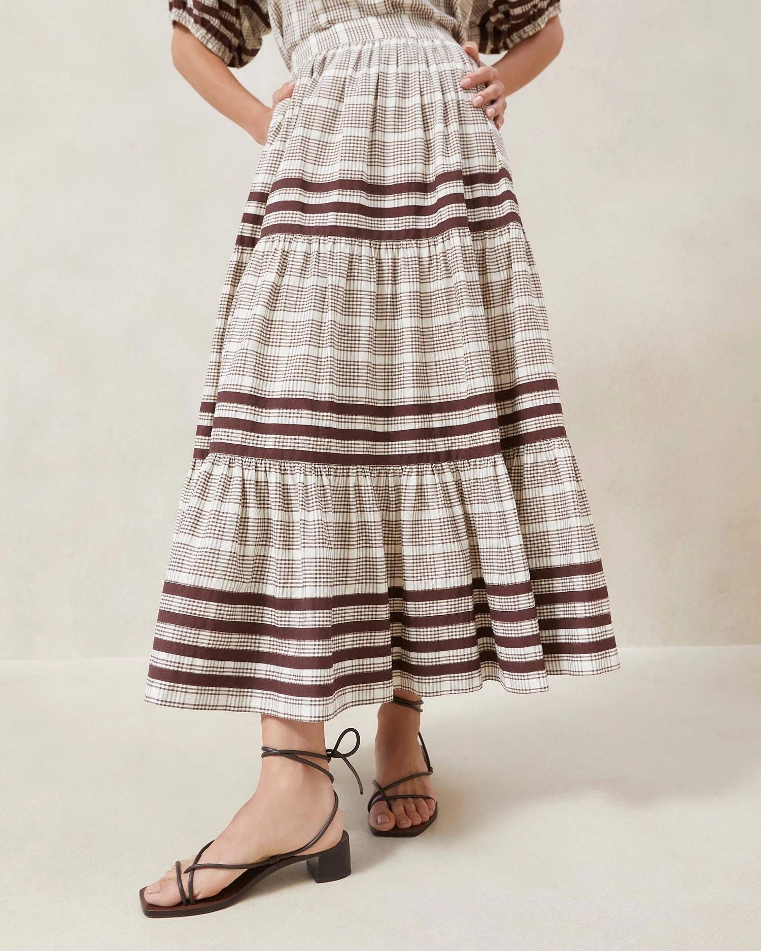 Tiered skirt in chocolate brown and cream-colored plaid cotton fabric with chocolate brown grosgrain ribbon trim. Features side pockets.