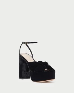 Knotted, heeled platform sandal in black velvet with a pieced mignon strap. Features a padded leather footbed with gold stamped logo, an open toe, and an adjustable buckle ankle strap. 4.75-inch heel, 2-inch platform.